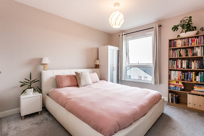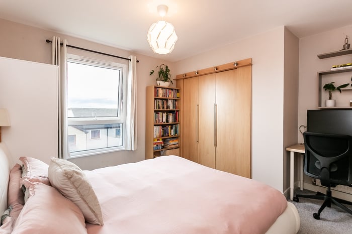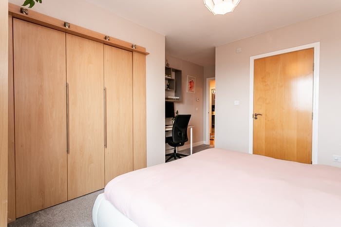 With ample space for a dining table and chairs, it offers a practical yet sociable setting for everyday living and hosting guests. The master bedroom benefits from soft carpeted flooring, a built-in wardrobe with bi-fold doors and access to a convenient en suite, providing both comfort and functionality.
