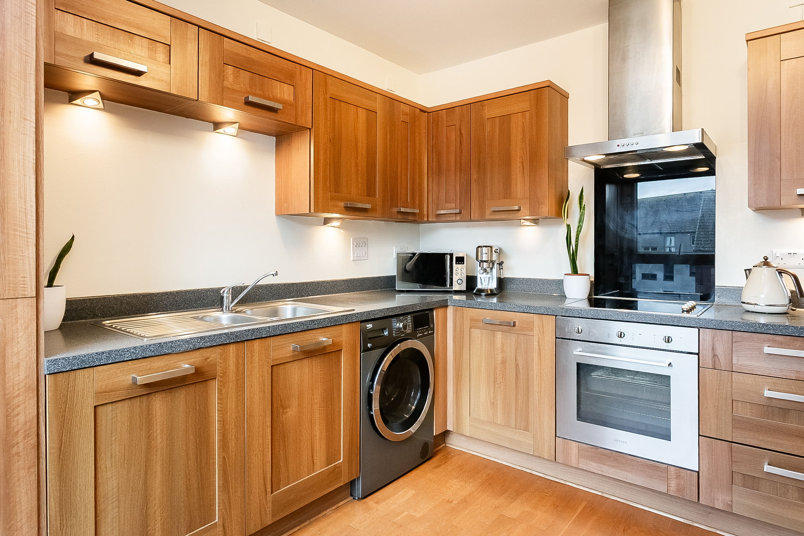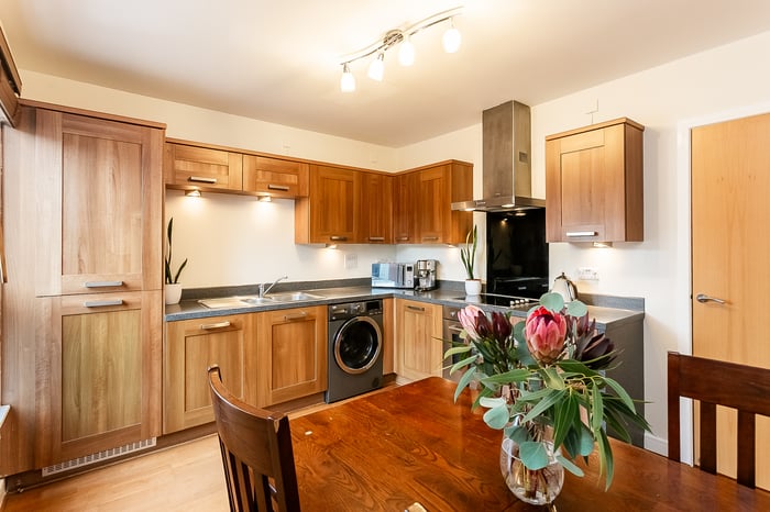 The fitted kitchen dining room continues the wood effect flooring and is complemented by stone effect worktops, a range of fitted wall and base units and a sink with drainer. Integrated appliances include a fridge/freezer, dishwasher, SMEG oven and an electric hob with a canopy above.