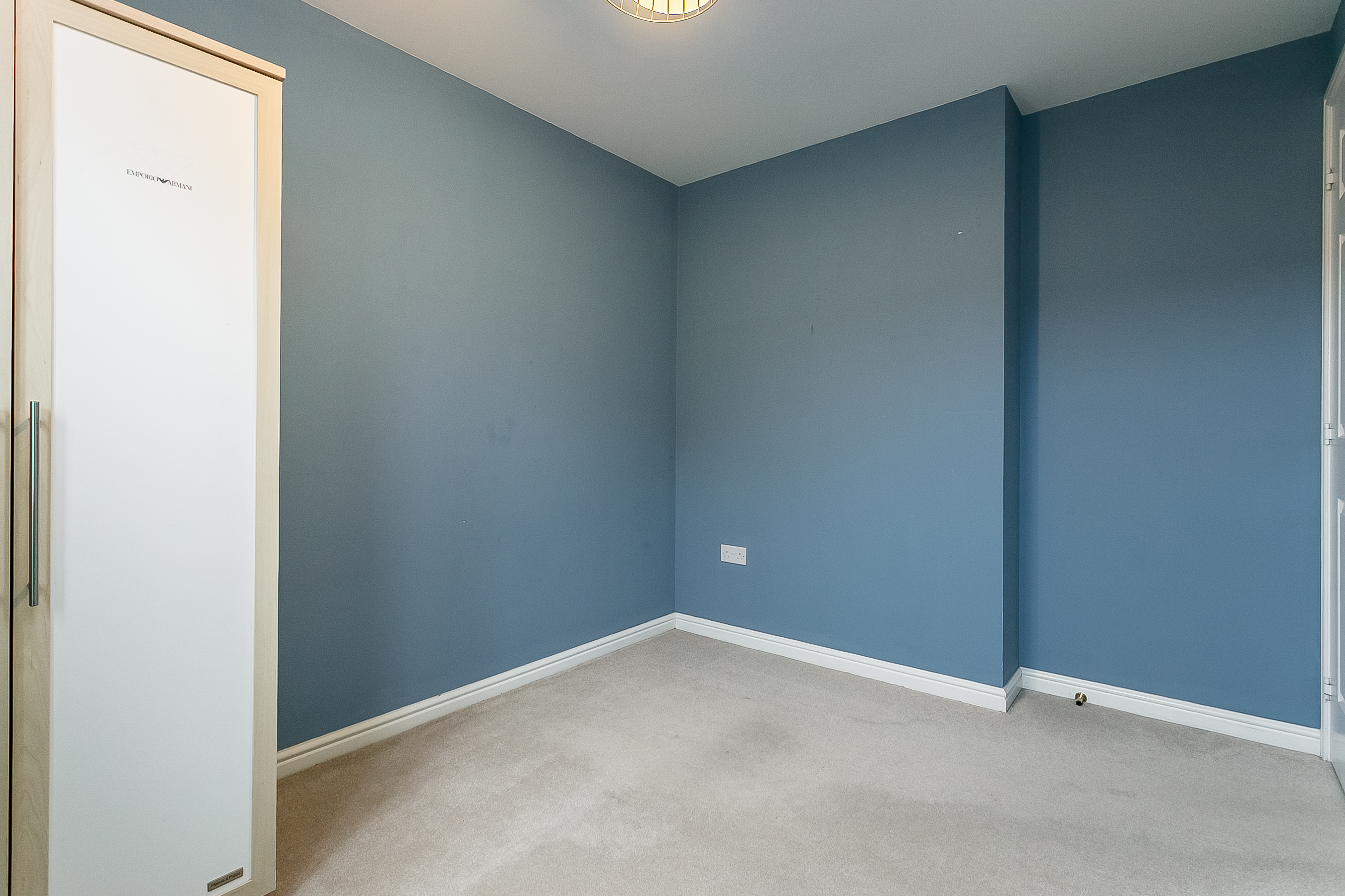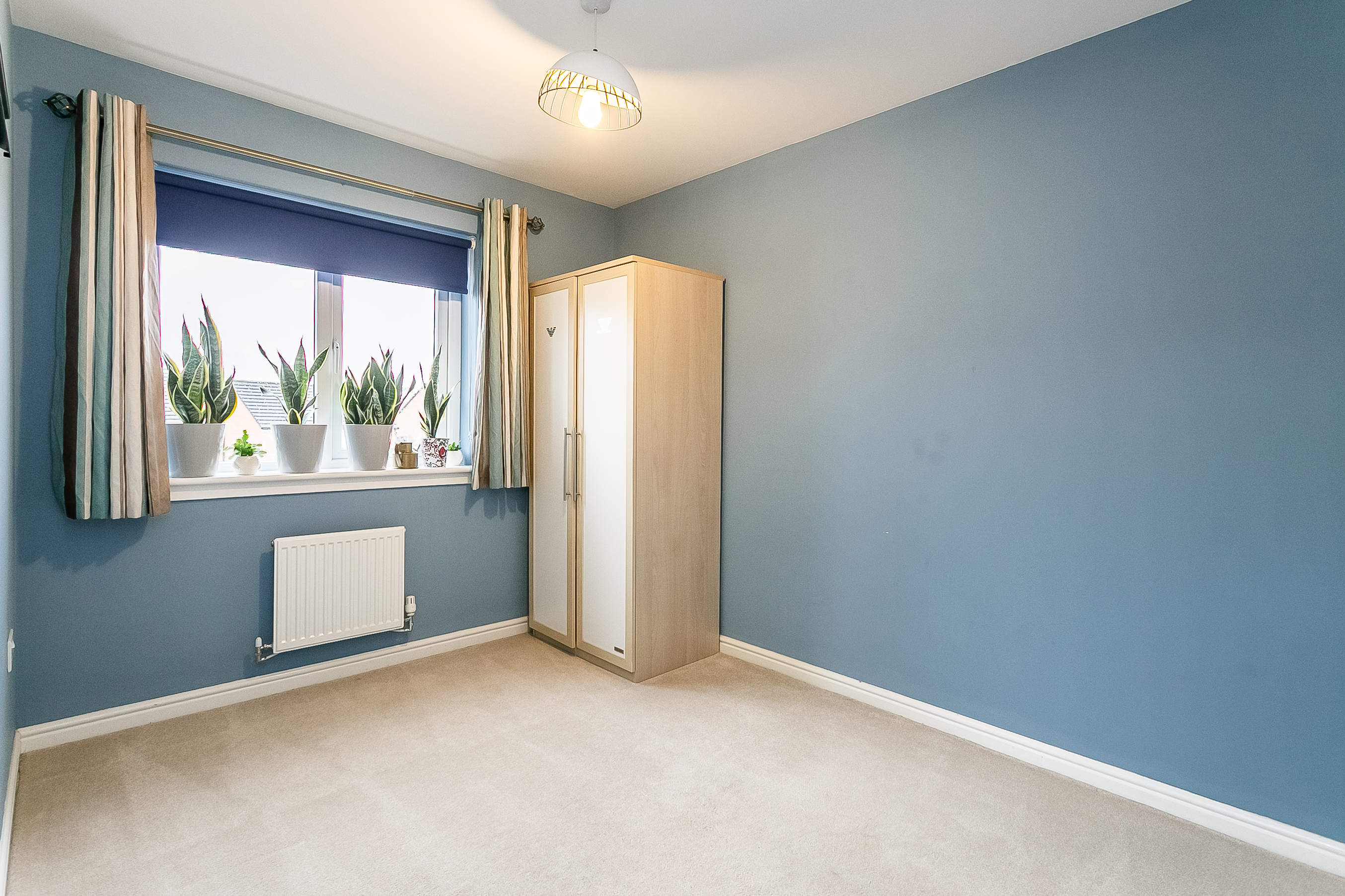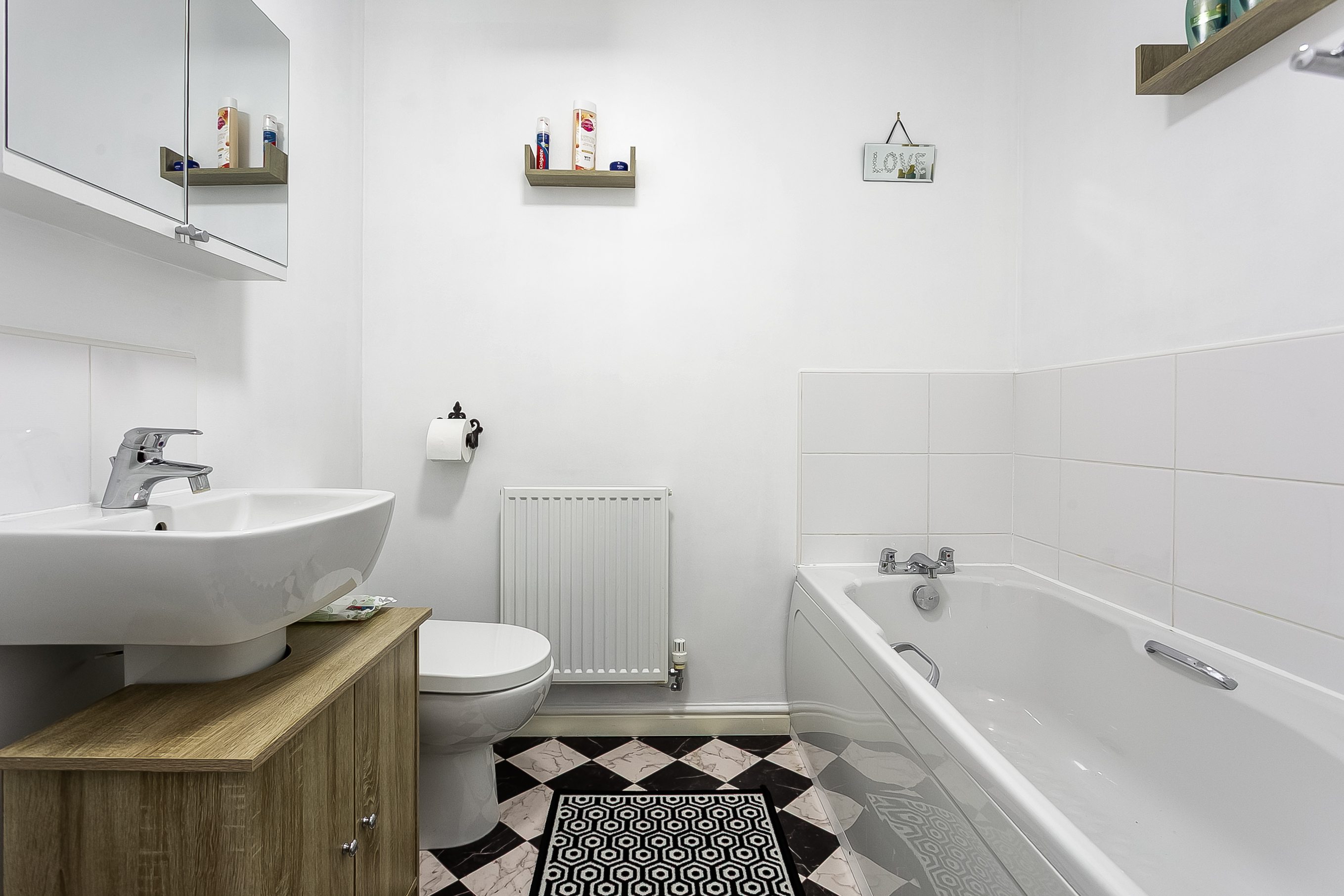 The third bedroom is a well-sized single room, ideal as a child’s bedroom, guest room or home office. Completing the accommodation, the contemporary three-piece family bathroom comprises tiled-effect flooring, a tiled splashback surround and a central light fitting, offering a clean and stylish finish throughout.