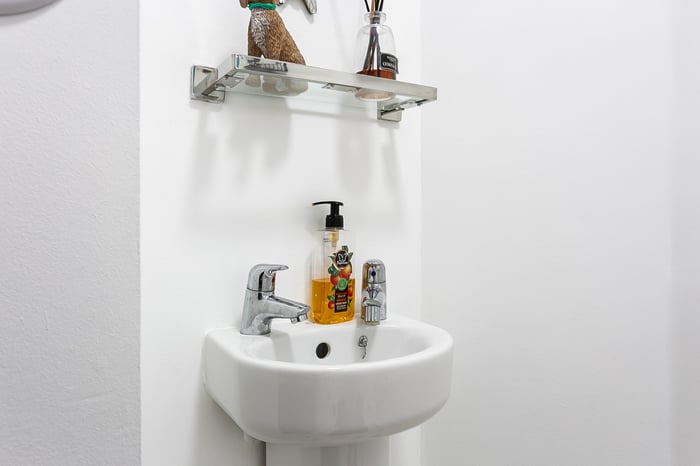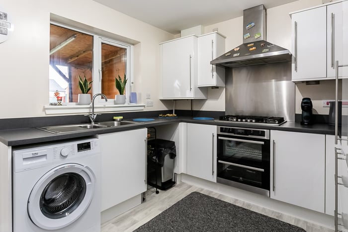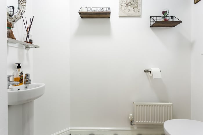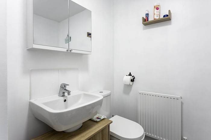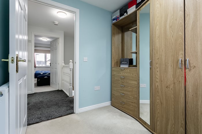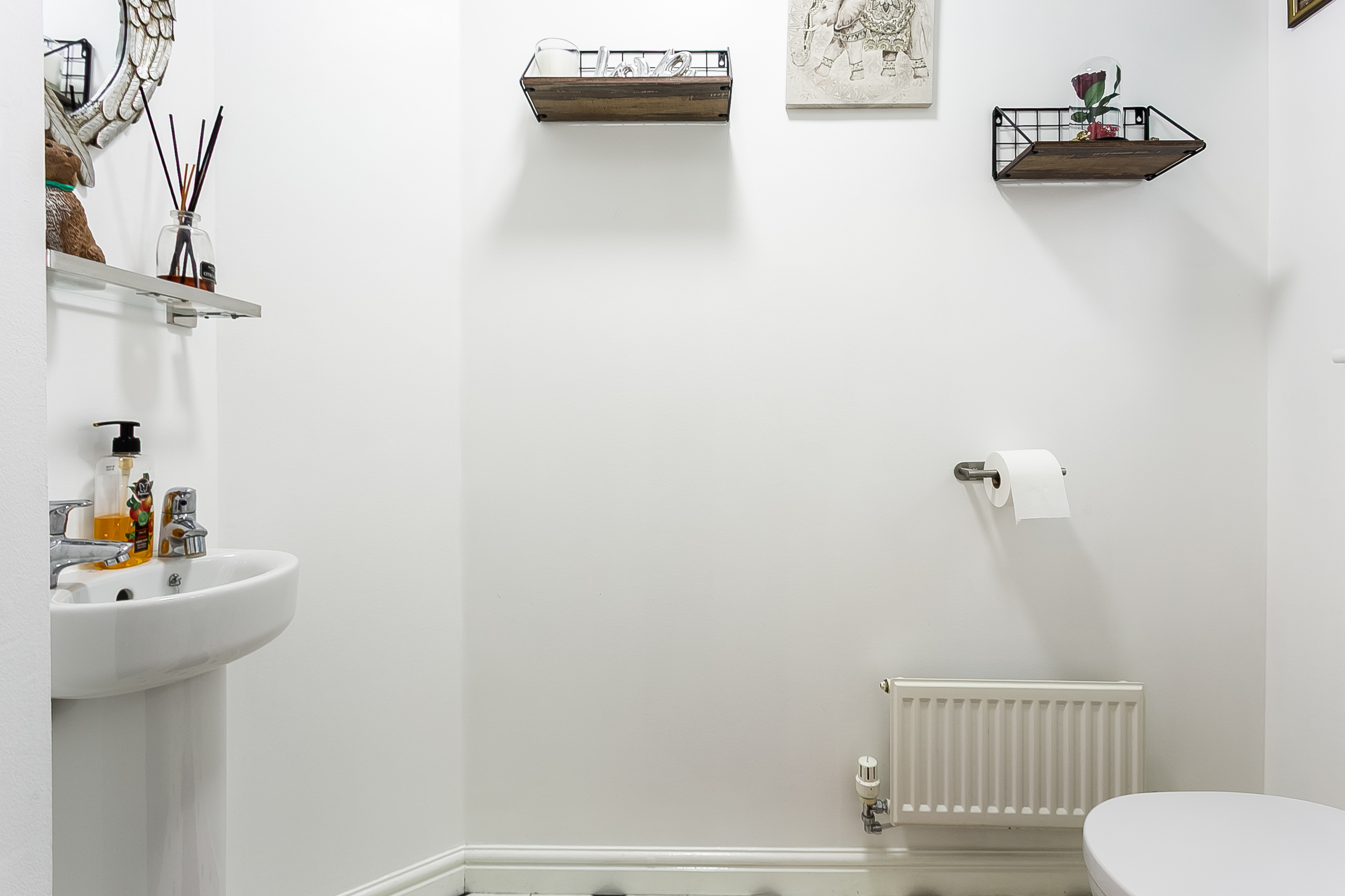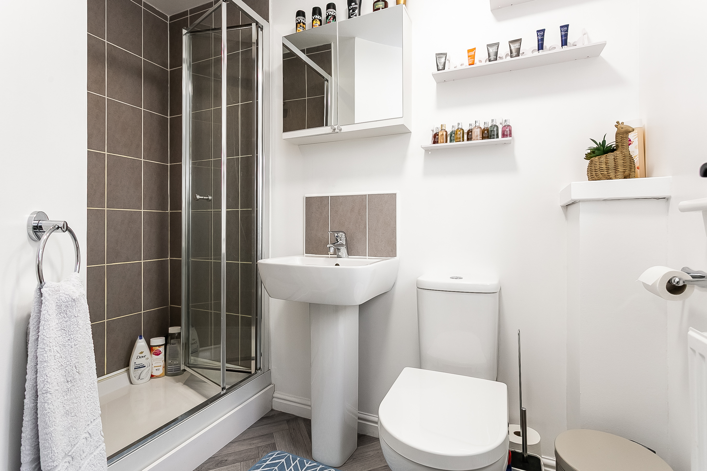 The third bedroom is a well-sized single room, ideal as a child’s bedroom, guest room or home office. Completing the accommodation, the contemporary three-piece family bathroom comprises tiled-effect flooring, a tiled splashback surround and a central light fitting, offering a clean and stylish finish throughout.