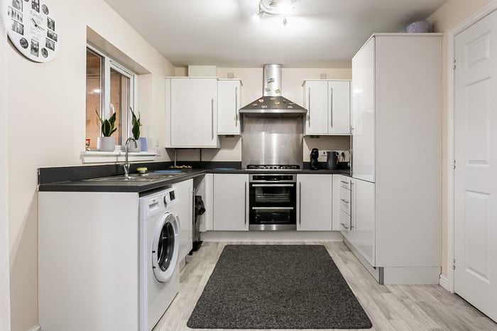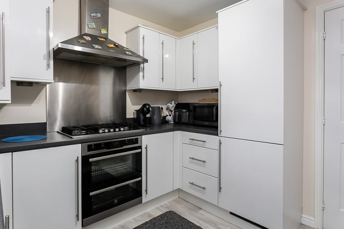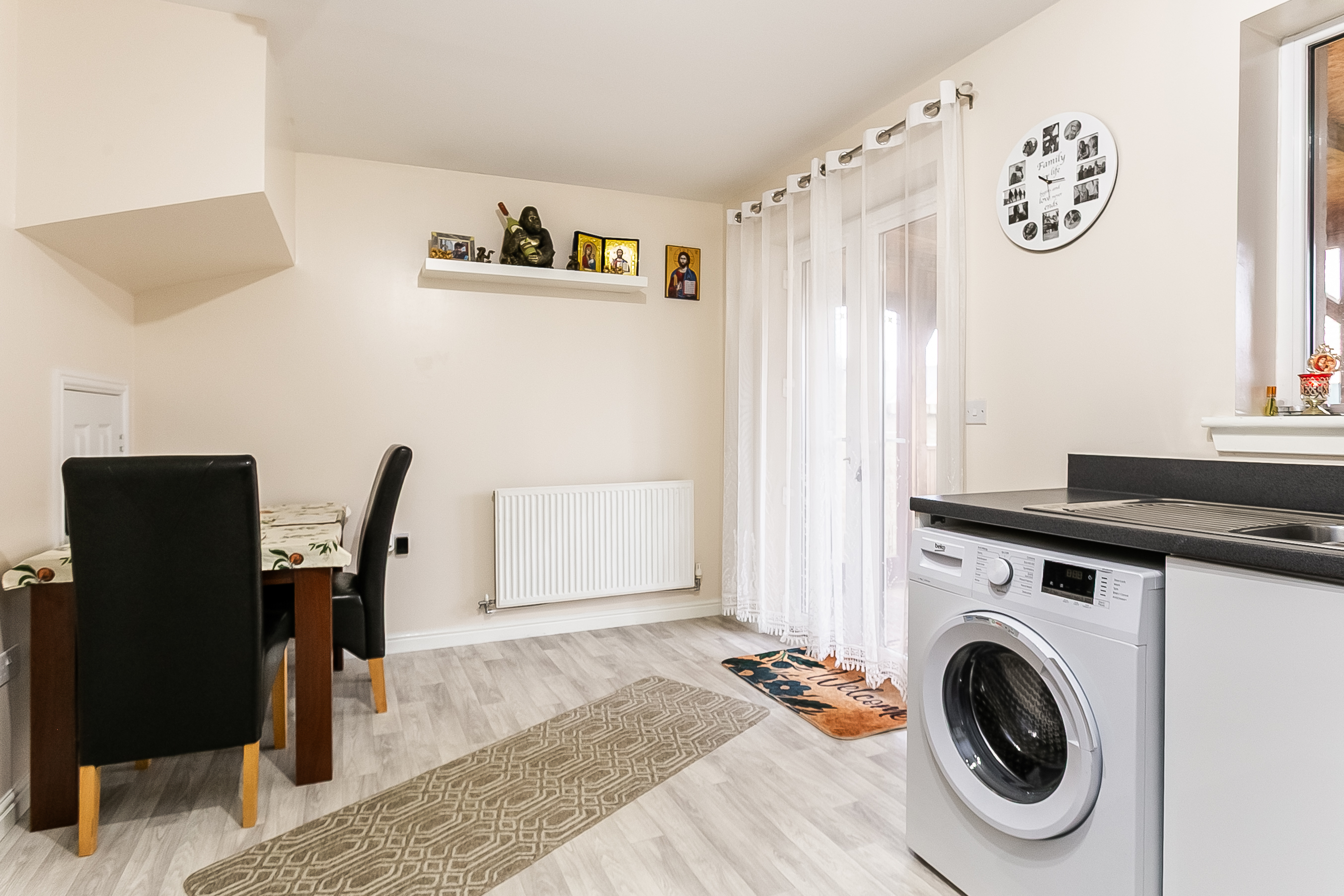 Generous in size, the room offers ample space for a range of seating arrangements, making it ideal for both relaxing evenings and entertaining guests. Accessed via the living room, the kitchen/dining room is well-appointed with wood-effect flooring, stone-effect worktops, a central light fitting and a useful built-in storage cupboard.
