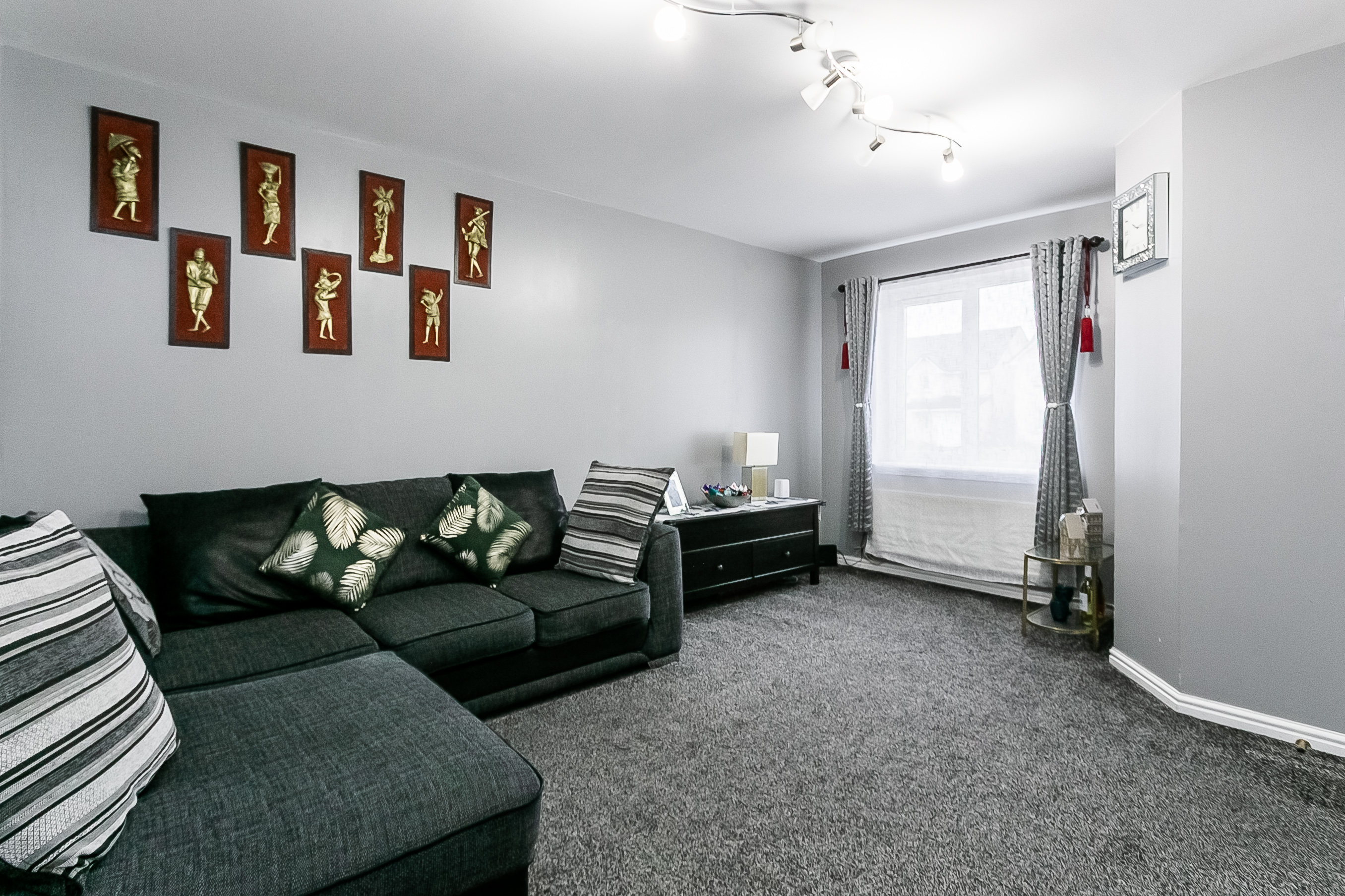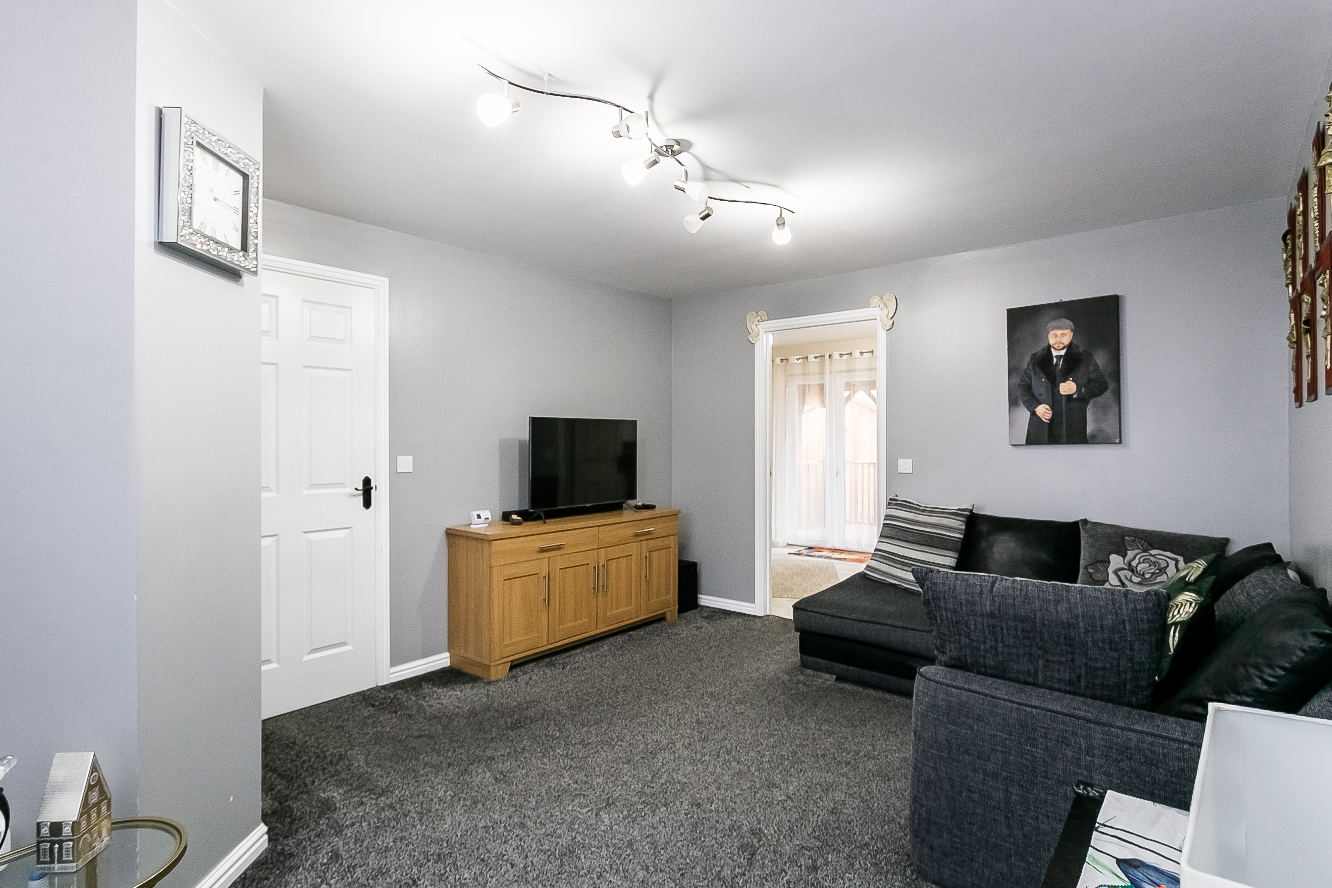 The welcoming entrance hall provides access to all ground-floor accommodation and includes a conveniently positioned WC. The spacious living room is beautifully presented with soft carpeted flooring, a central light fitting and a large window that fills the room with natural light, creating a bright yet cosy setting.
