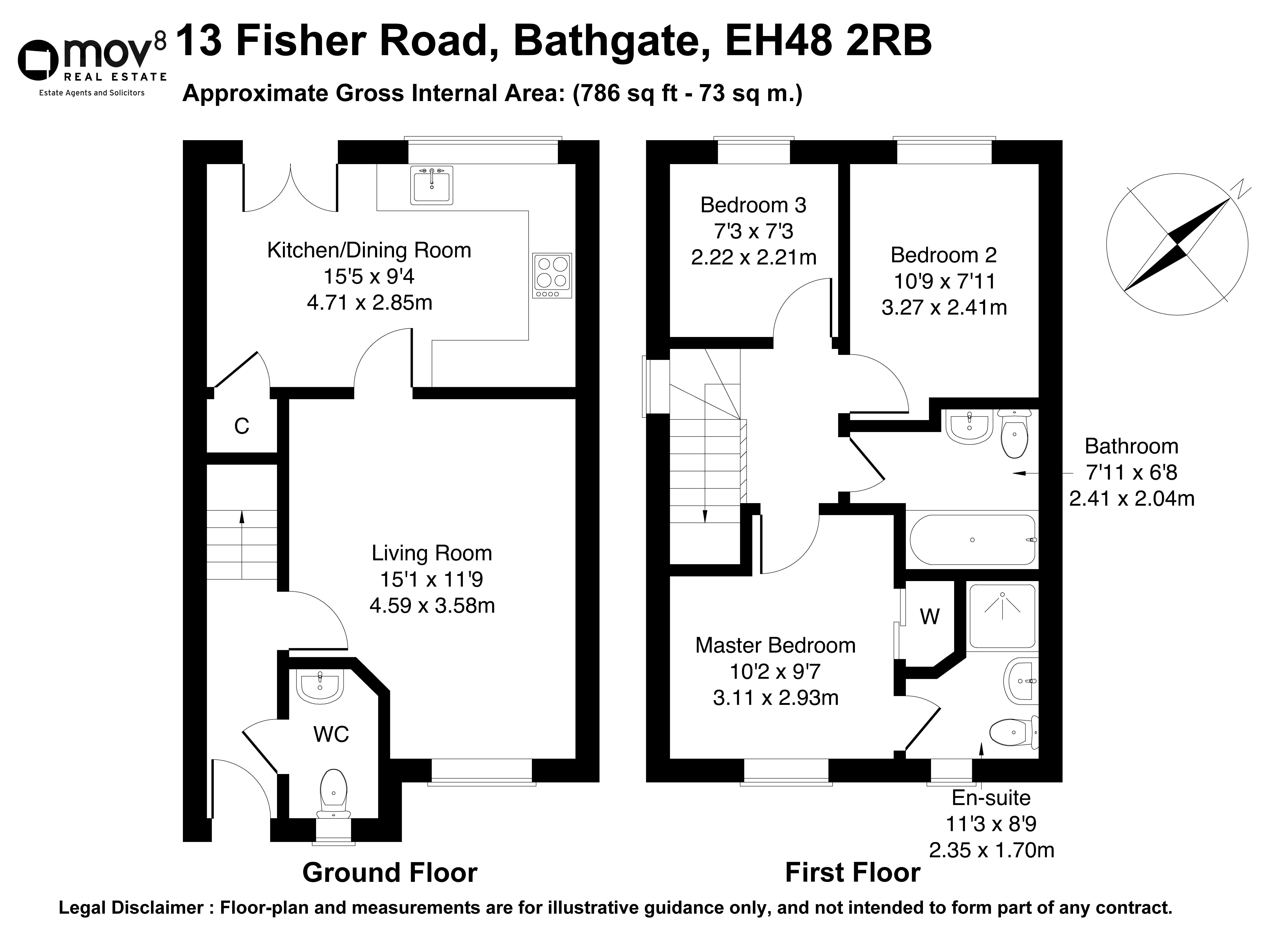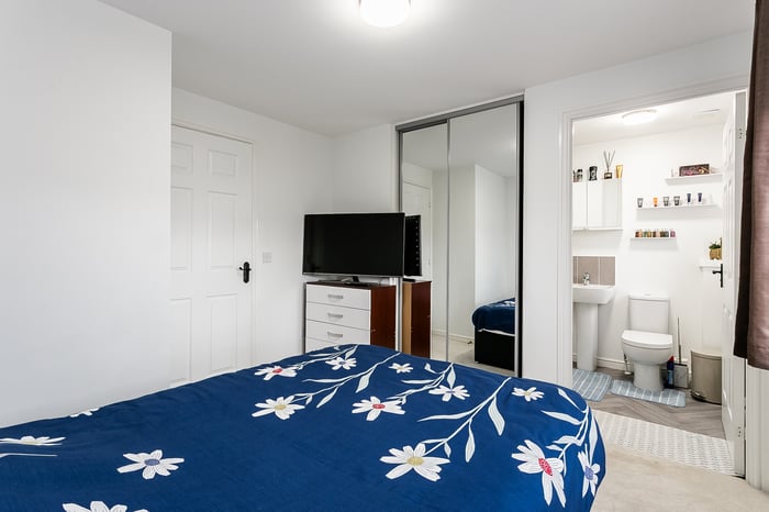 Upstairs, the master bedroom is a comfortable and well-proportioned double room featuring carpeted flooring, a built-in wardrobe with mirrored sliding doors and access to a modern en suite shower room. The second bedroom is another generous double, complete with carpeted flooring and space for freestanding furniture.