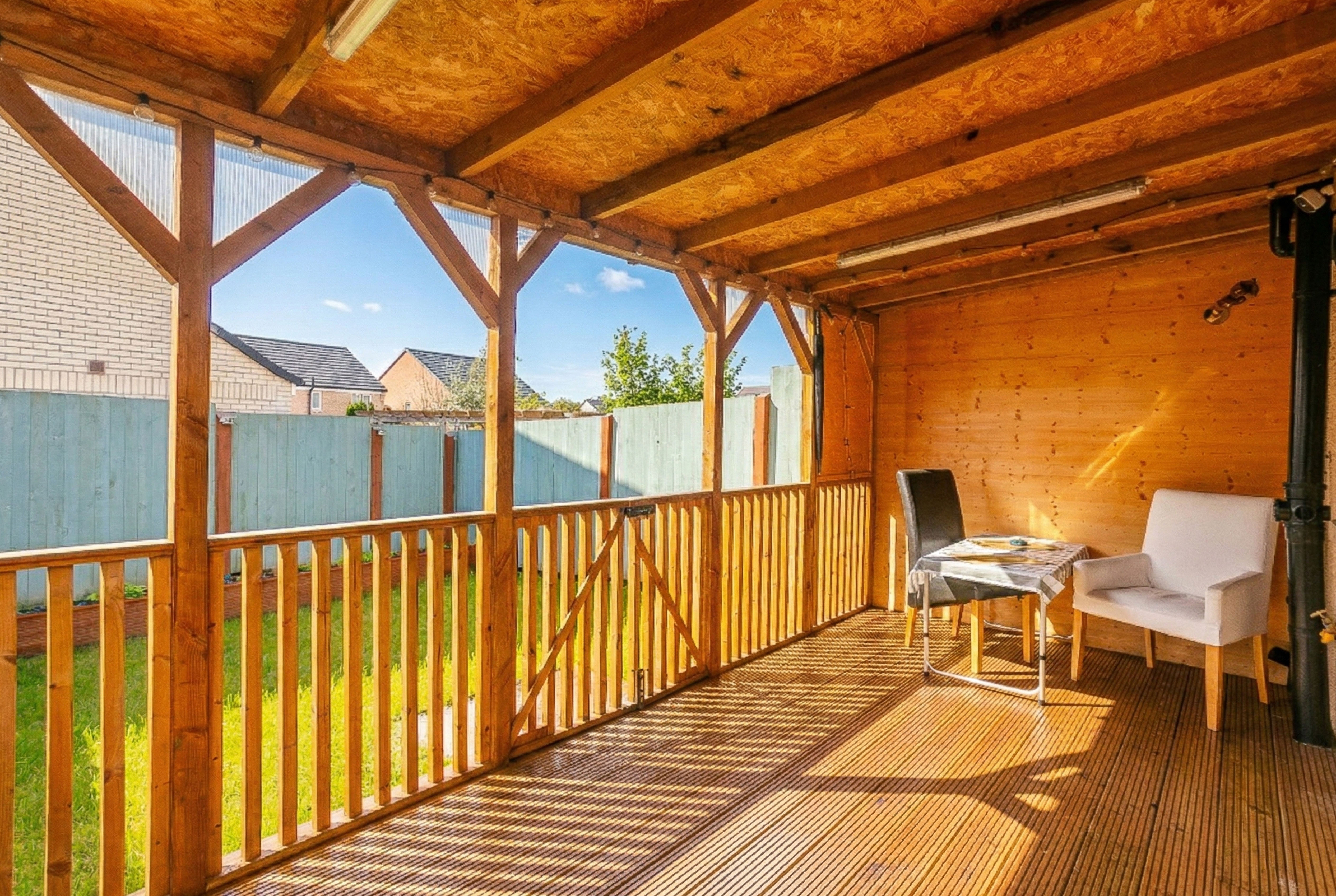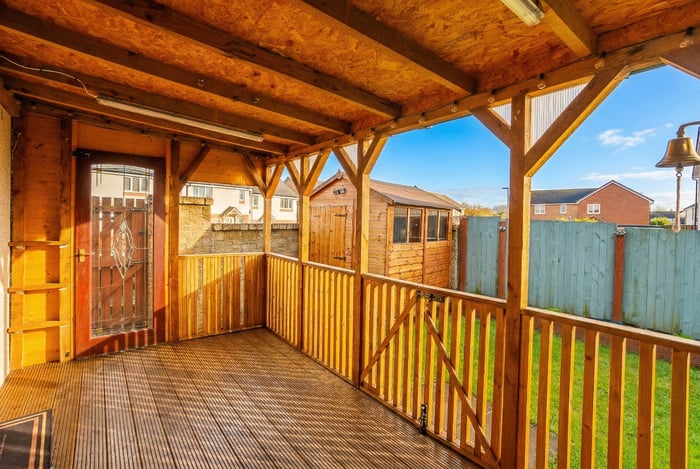 French doors open directly onto the wooden decking, allowing for a seamless connection between indoor and outdoor living, perfect for family dining and summer gatherings. Appliances include a washing machine, integrated fridge freezer, integrated oven and a five-ring gas hob with canopy extractor above.