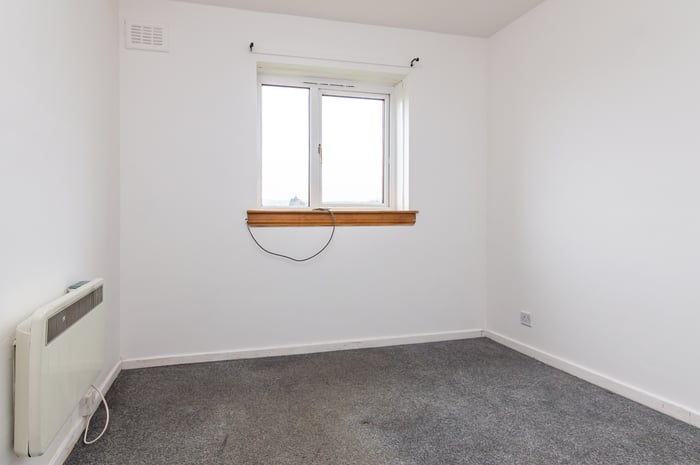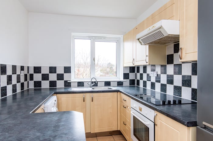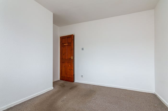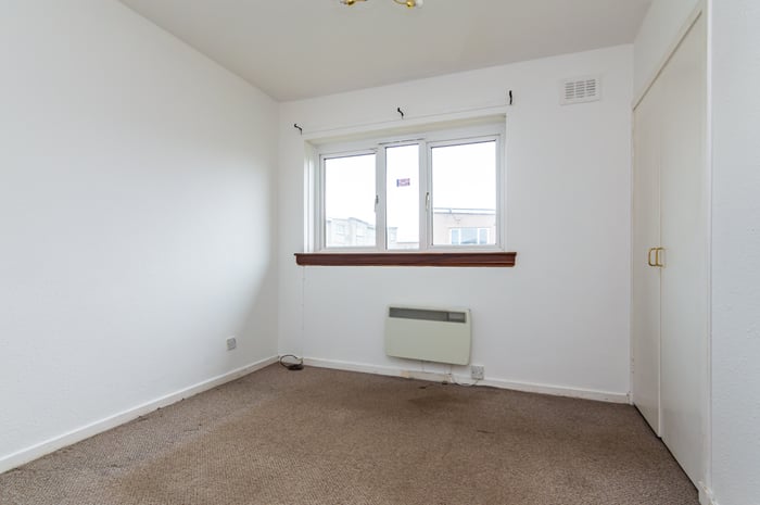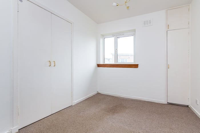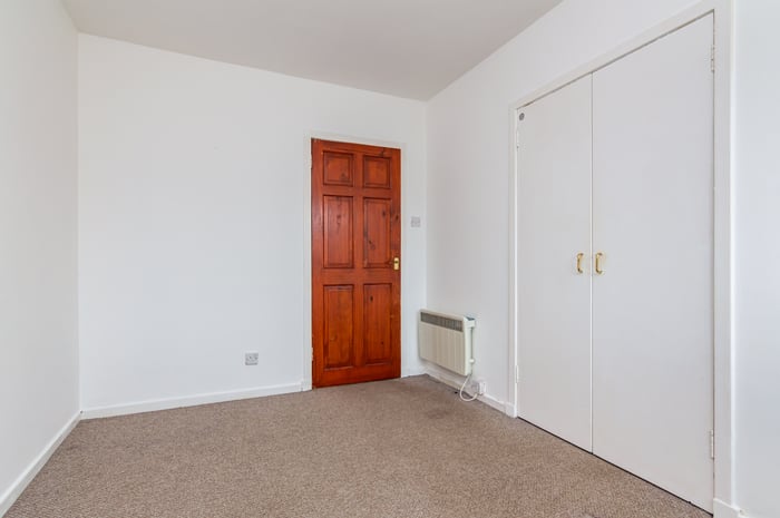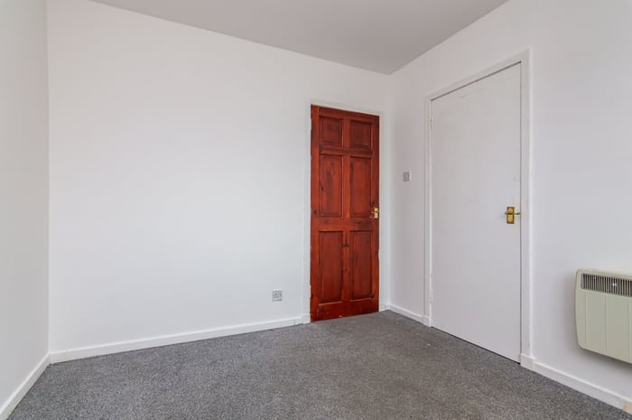Appliances include an integrated oven, ceramic hob with an extractor hood above, and a freestanding washing machine and fridge/freezer. Bedroom one is set to the rear, with carpeted flooring, a built-in wardrobe and ceiling mounted lighting, whilst bedrooms two and three are similarly sized and finished, with built-in storage and space for freestanding bedroom furniture.