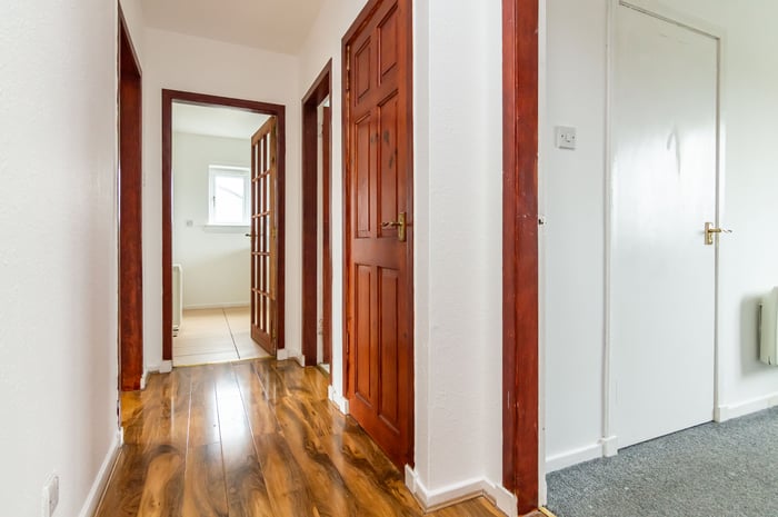 Bright and spacious, three-bedroom, triple-aspect, second floor flat, in a residential area located in the popular Corstorphine district, to the west of Edinburgh city centre. The long entrance hall serves each room within the property and includes a storage cupboard.