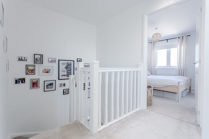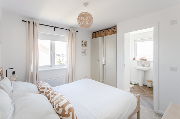 This stylishly appointed kitchen is ideal for both everyday living and entertaining, featuring modern fitted units and worktops, including matching upstands, a sink with a drainer, and an integrated eye-level double oven, a gas hob, a fridge/freezer, a washing machine and a dishwasher. On the upper hall, the master bedroom is well-finished with light decor, carpeted flooring, plenty of space for storage, and a stylish en-suite shower room.
