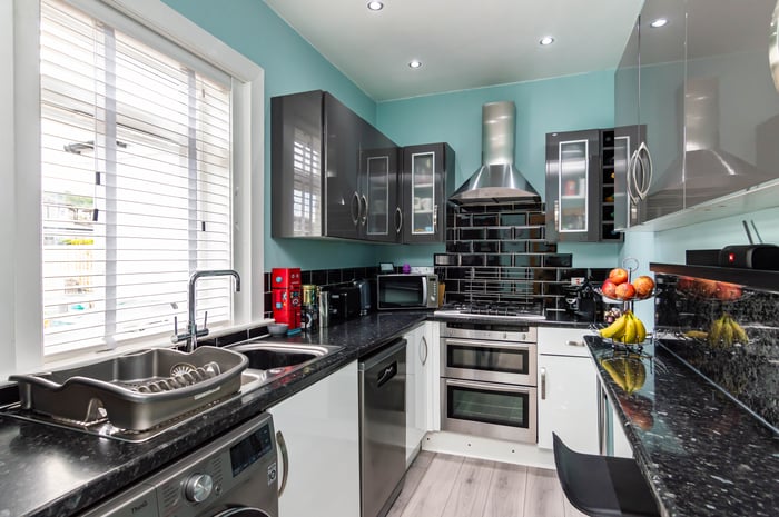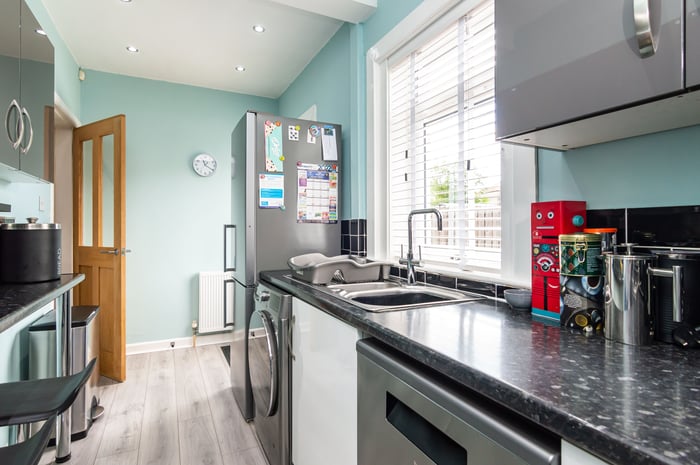 With a door accessing the rear garden, the kitchen is fitted with modern units, stone effect worktops, a stainless steel sink, a breakfast bar and tiled splashbacks. Appliances include an integrated five burner gas hob, double oven and extractor hood, with space and plumbing for further freestanding white goods.