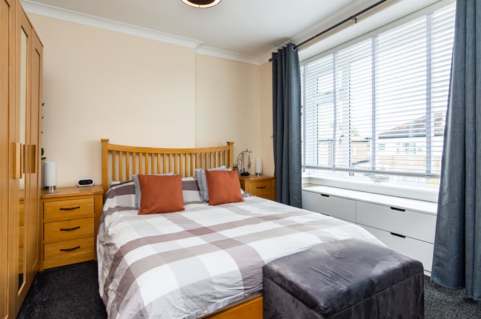 Upstairs, front-set bedroom one features carpeted flooring, a box bay window and a built-in wardrobe, whilst bedroom two likewise has carpeted flooring, and may be used flexibly as a guest bedroom, nursery or study. Completing the accommodation, the well-appointed shower room is fitted with a modern white two-piece suite with a rain-head mains shower set in a walk-in enclosure, panelled splash walls and a modern feature radiator.
