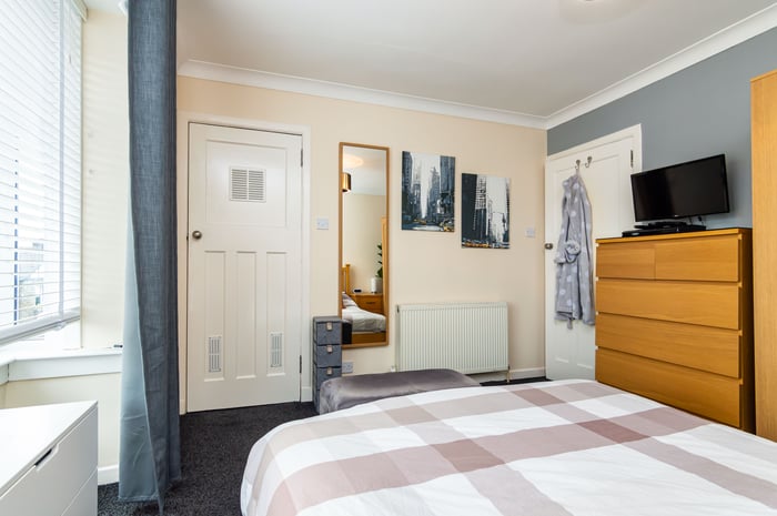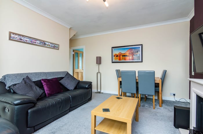 ** CLOSING DATE SET – TUESDAY 21ST JUNE @ 12NOON ** Beautifully presented, two bedroom, end-terrace house with private gardens and a driveway, set on a quiet residential street, located in the popular West Dunbartonshire town of Dumbarton. The entrance vestibule has space for outerwear, carpeted stairs leading up to the landing, and opens into the bright living/dining room which features carpeted flooring, a modern electric fire and ample space for both lounge and dining furniture.