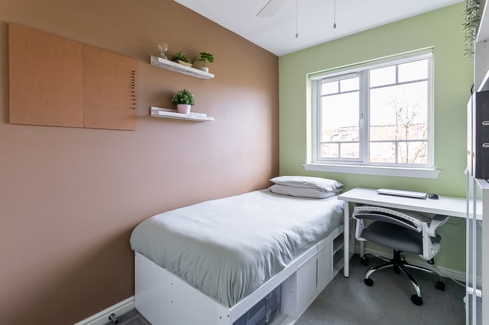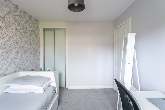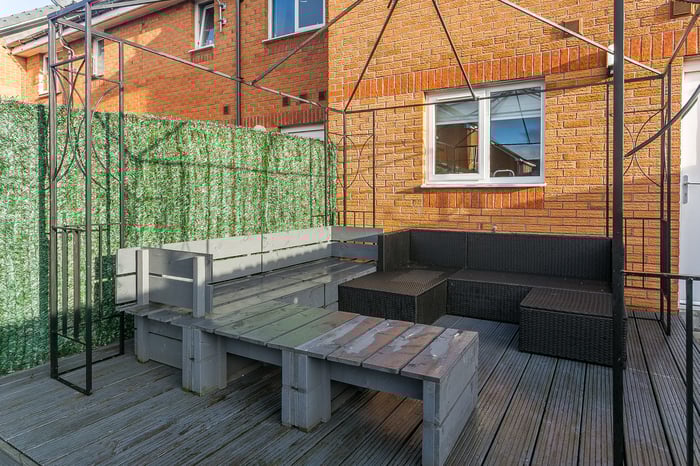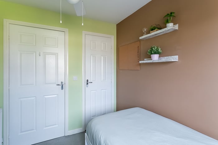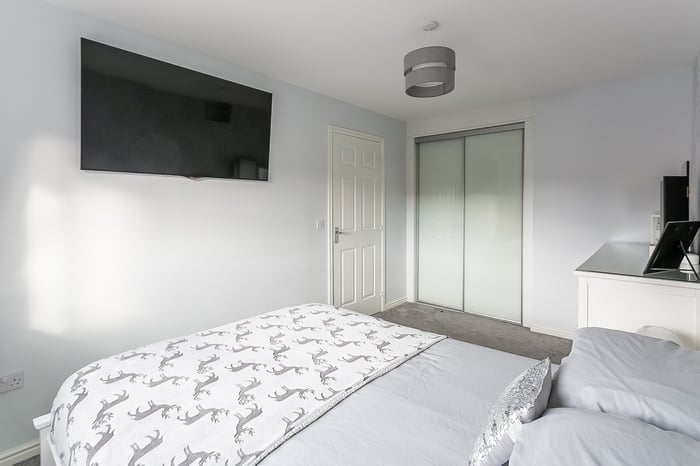 On the first floor, bedroom one overlooks the rear garden, offering a spacious room for freestanding furnishing, and includes carpeted flooring, a built-in wardrobe and a TV point. Two further flexible bedrooms are set to the front, and also feature carpeted flooring and built-in storage space.