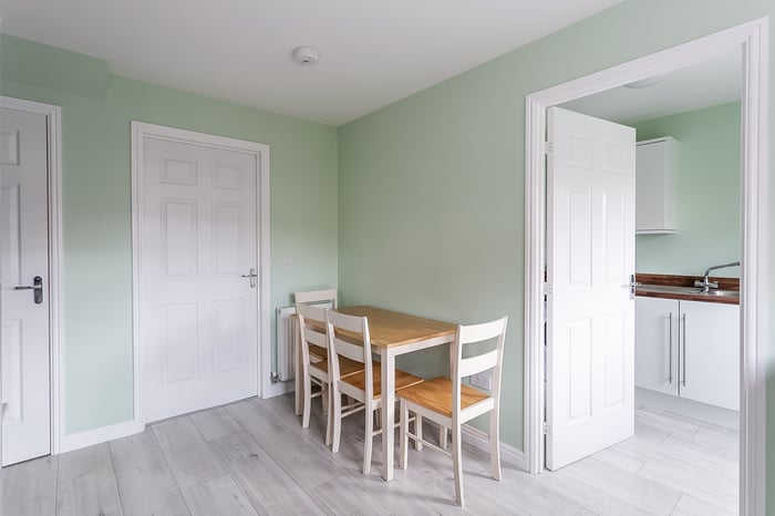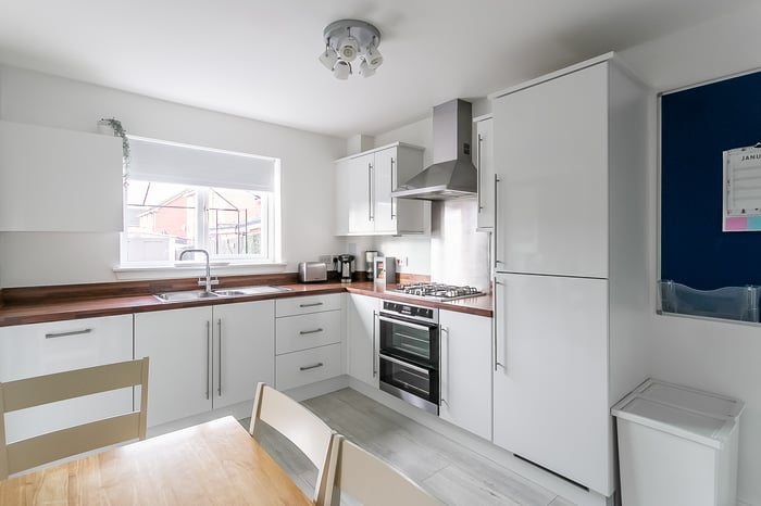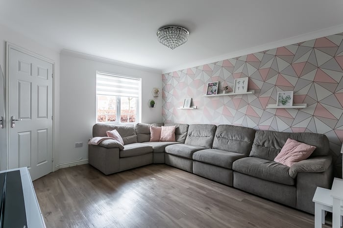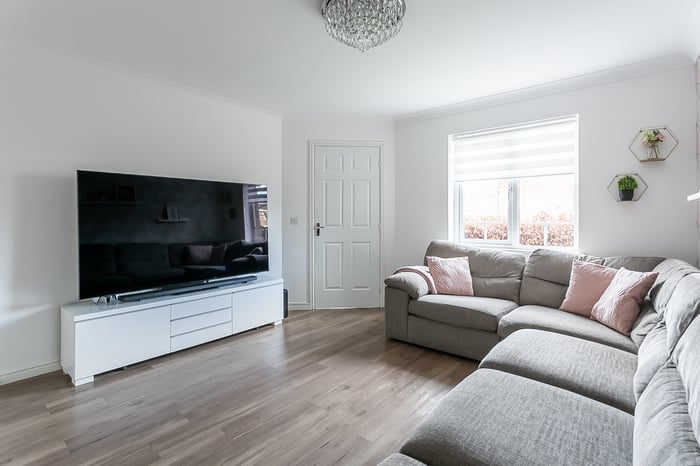 Set to the front, a good-sized living room features a central light fitting and quality Karndean flooring continuing from the hall. Set off the lounge, is a bright stylish kitchen with modern wood-effect flooring, space for a dinner table and access to the deep under-stair storage cupboard.