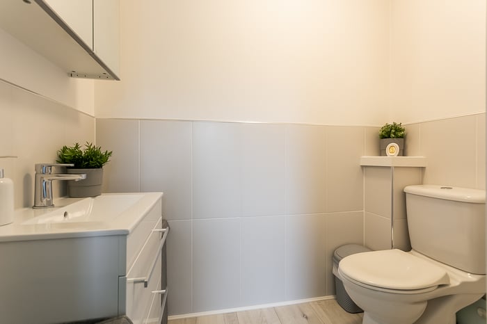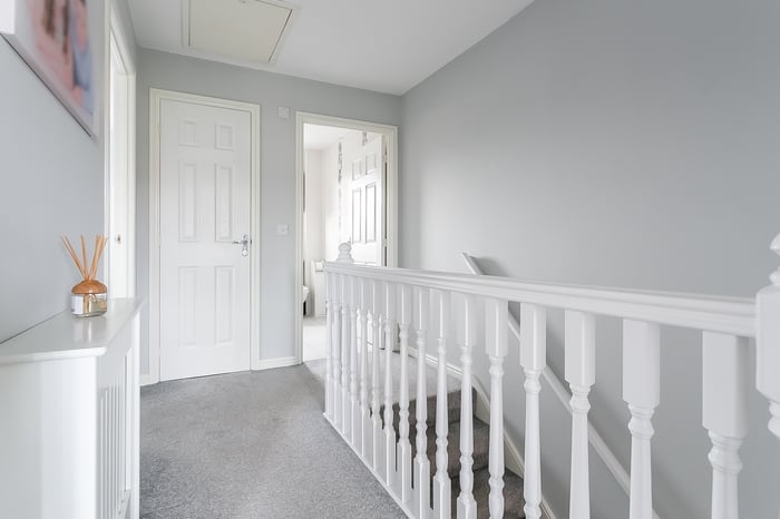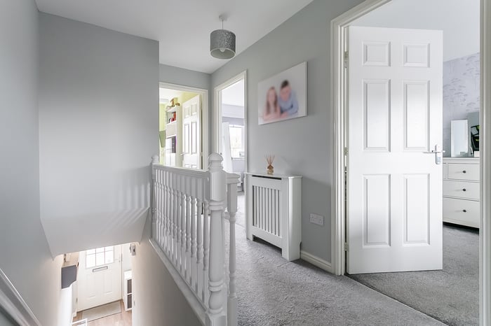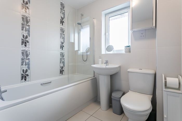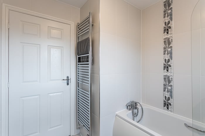 Completing the accommodation, a bright fully-tiled family bathroom is fitted with a three-piece suite, including a mains shower over the bath, a ladder-style radiator and a shaver point.