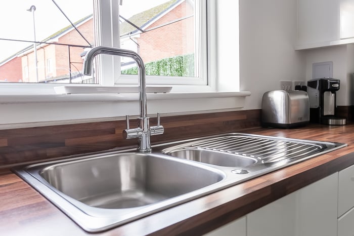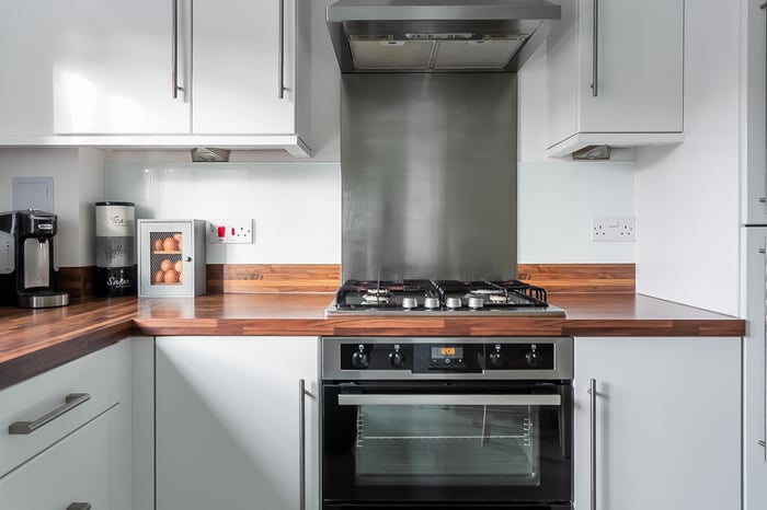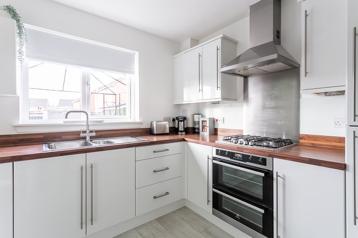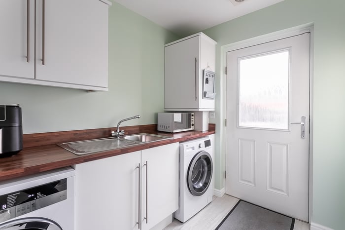 Modern fitted units include wood-effect worktops with matching upstands, a sink with a drainer; and an integrated dishwasher, fridge/freezer, double oven and gas hob. Set off the kitchen, a utility room has a door leading to the garden; fitted units and worktops with a sink; and further access to the WC with a two-piece suite.