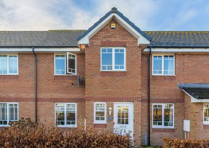 Immaculately presented, three-bedroom, mid-terrace home with gardens and two allocated parking spaces. Set ‘off-street’ adjacent to a ‘village green’ in a modern family-orientated development in the Dumbarton area, West Dunbartonshire, northwest of Glasgow. A welcoming entrance hall offers ample cloak space and gives access to the lounge and the carpeted stairway.