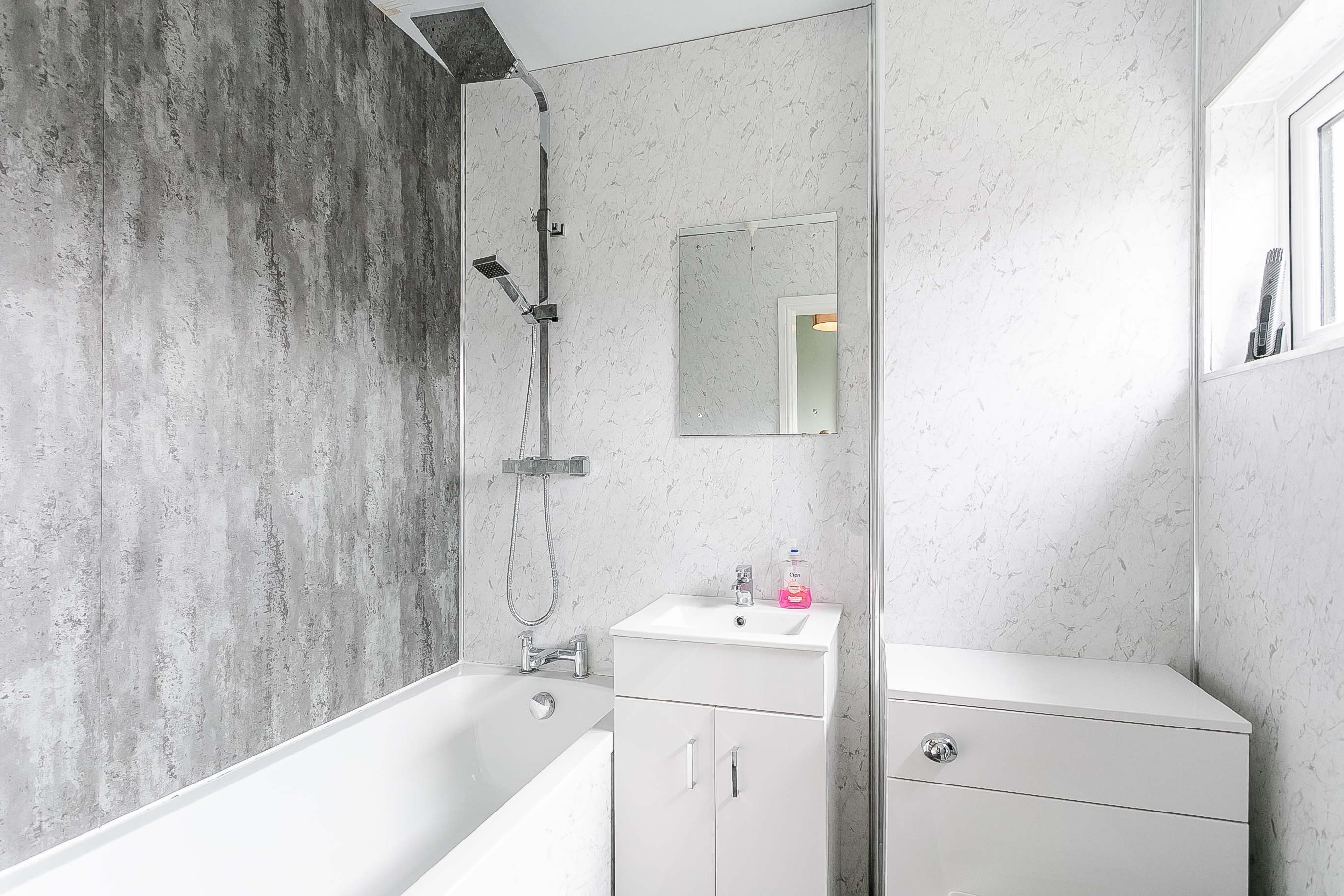 Upstairs, carpeted flooring leads to the first bedroom, finished with light décor, continued carpeting, and built-in cupboards, while the second bedroom also benefits from a built-in cupboard and a wall-mounted TV point. Completing the home, the family bathroom comprises a modern three-piece suite with panelled walls, a shower over the bath, and a ladder-style radiator.