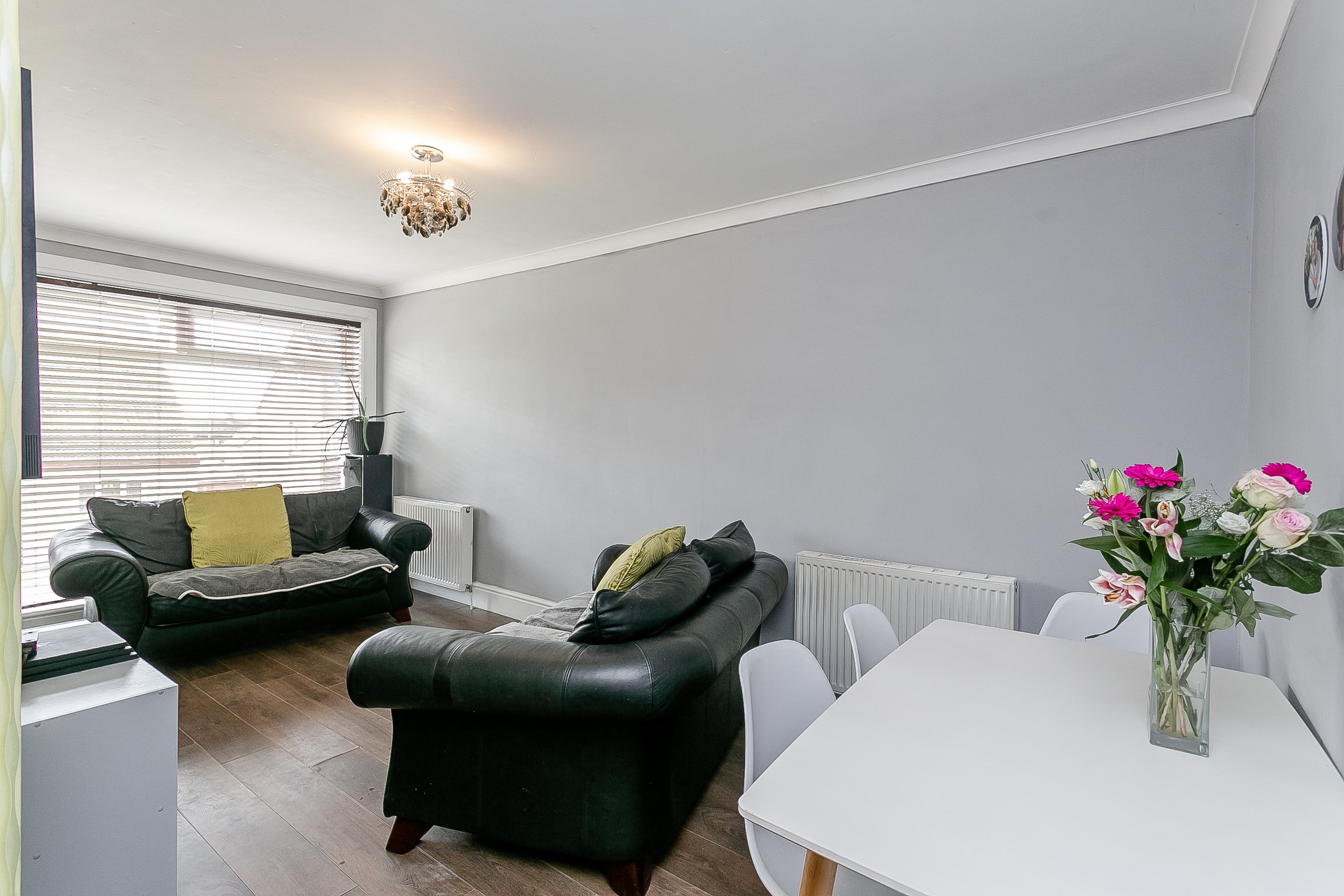 An inviting entrance with wood-effect flooring welcomes you into the property, flowing seamlessly into the spacious living and dining area, enhanced by a large window that fills the room with natural light and complemented by a wall-mounted TV point. Continuing through, the kitchen retains the wood-effect flooring and features matching countertops, a stainless steel sink with drainer, an integrated oven and electric hob with canopy above, and a dishwasher, while a separate utility room provides additional space for two appliances along with useful cupboard storage.