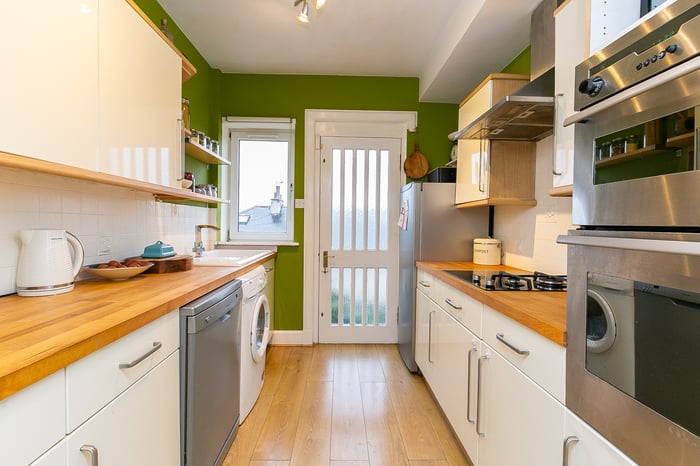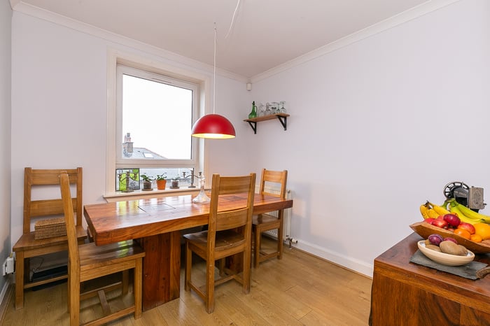 A bright, welcoming entrance hall, with understairs storage, provides access to a well-proportioned living room, filled with natural light from a wide, front-facing window which features smooth cornicing, hardwood flooring, a multi-fuel burning stove and an open Edinburgh Press. Leading off the living room, and overlooking the rear garden, a flexible dining room could alternatively be utilised as a third bedroom, if desired.