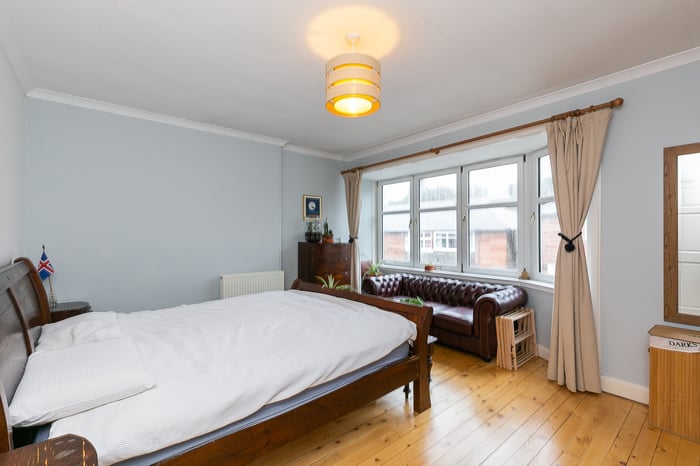 Upstairs, leading off a skylit landing, the front-facing main bedroom is spacious and tastefully presented, and features a built-in storage cupboard. Set to the rear, the second bedroom equally offers ample space for freestanding bedroom furniture.