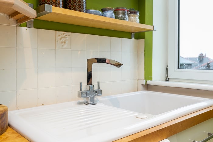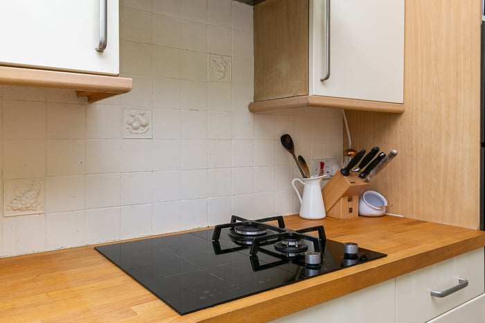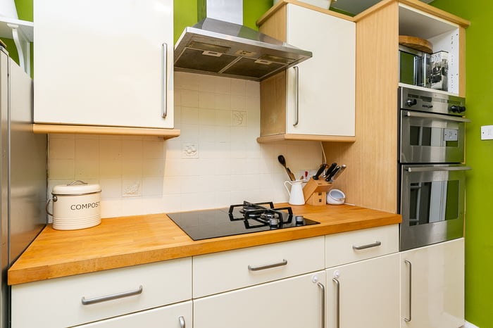 The rear-set kitchen, with garden access, features contemporary gloss-white units, solid beech worktops, a ceramic sink with a drainer and a tiled surround. Appliances include: an integrated eye-level oven and grill, an induction and gas hybrid hob with a canopy, a freestanding fridge, a washing machine and a dishwasher.