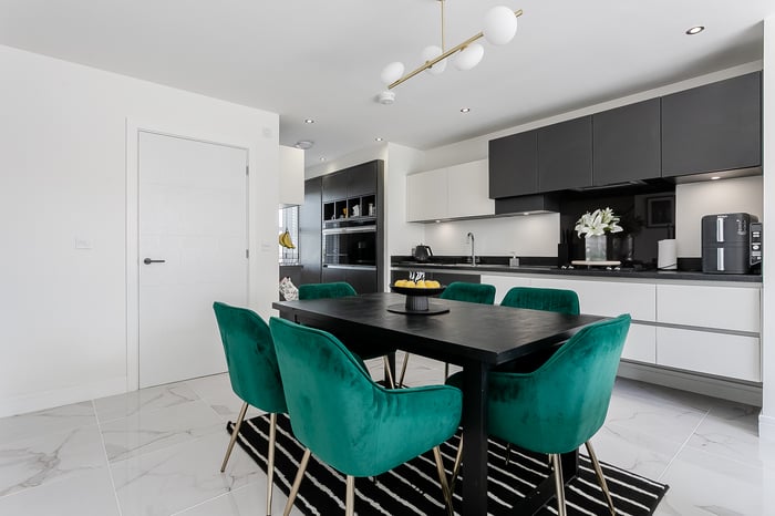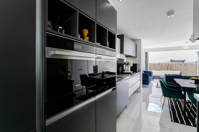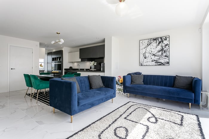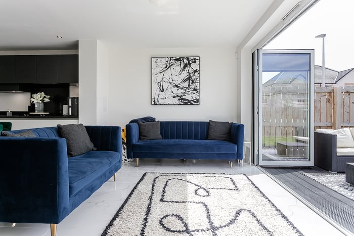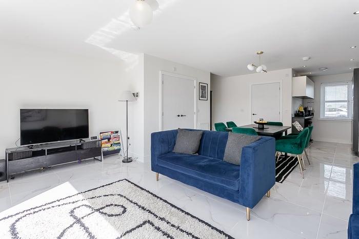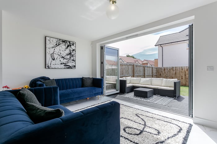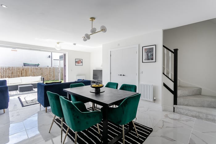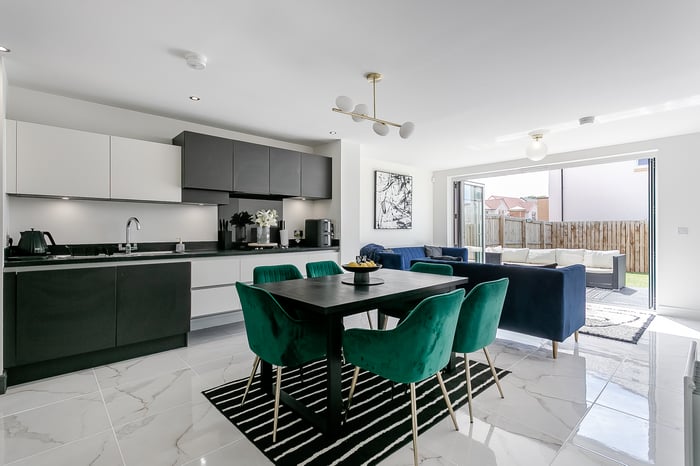 The open-plan living, kitchen, and dining area creates a modern and sociable space, ideal for both everyday living and entertaining. The living area features elegant marble-effect tiled flooring, a central light fitting, and striking bi-fold doors that open out onto the south-west-facing rear garden, flooding the space with natural light throughout the afternoon and evening.