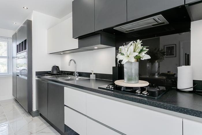 The contemporary kitchen is well-equipped with stone-effect worktops and a matching splashback surround, complemented by sleek spotlighting. Integrated appliances include a microwave/grill, washing drawer, dishwasher, washing machine, oven, and gas hob, making it a practical and functional area for cooking and entertaining.