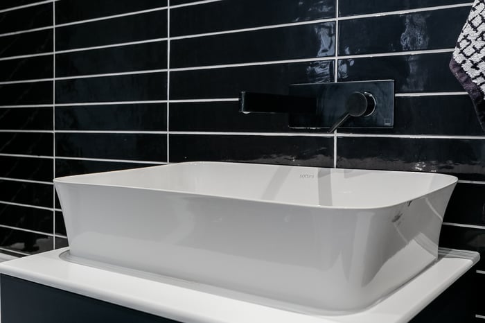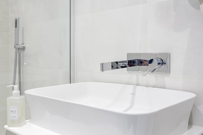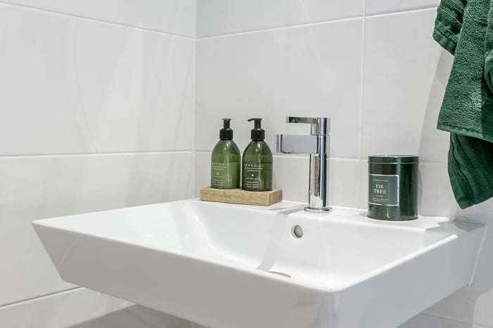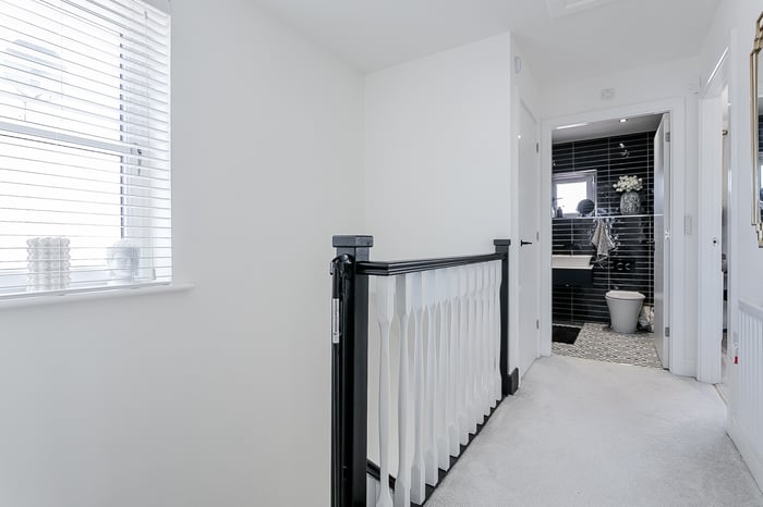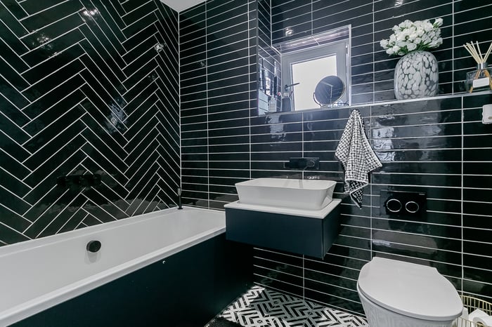 Completing the home, the family bathroom features a modern three-piece suite, herringbone tiled splashback, tiled-effect flooring, integrated rainfall ceiling shower head, and contemporary spotlighting, creating a sleek and relaxing environment.