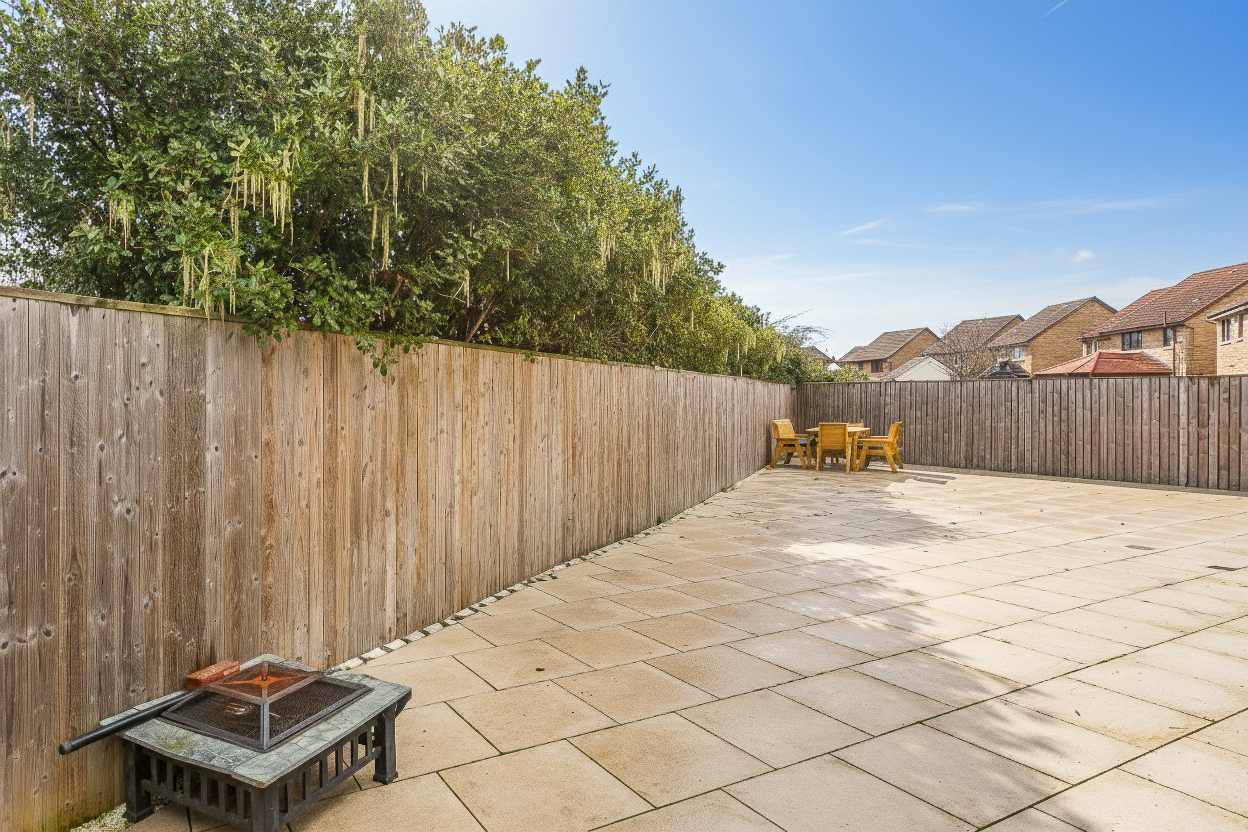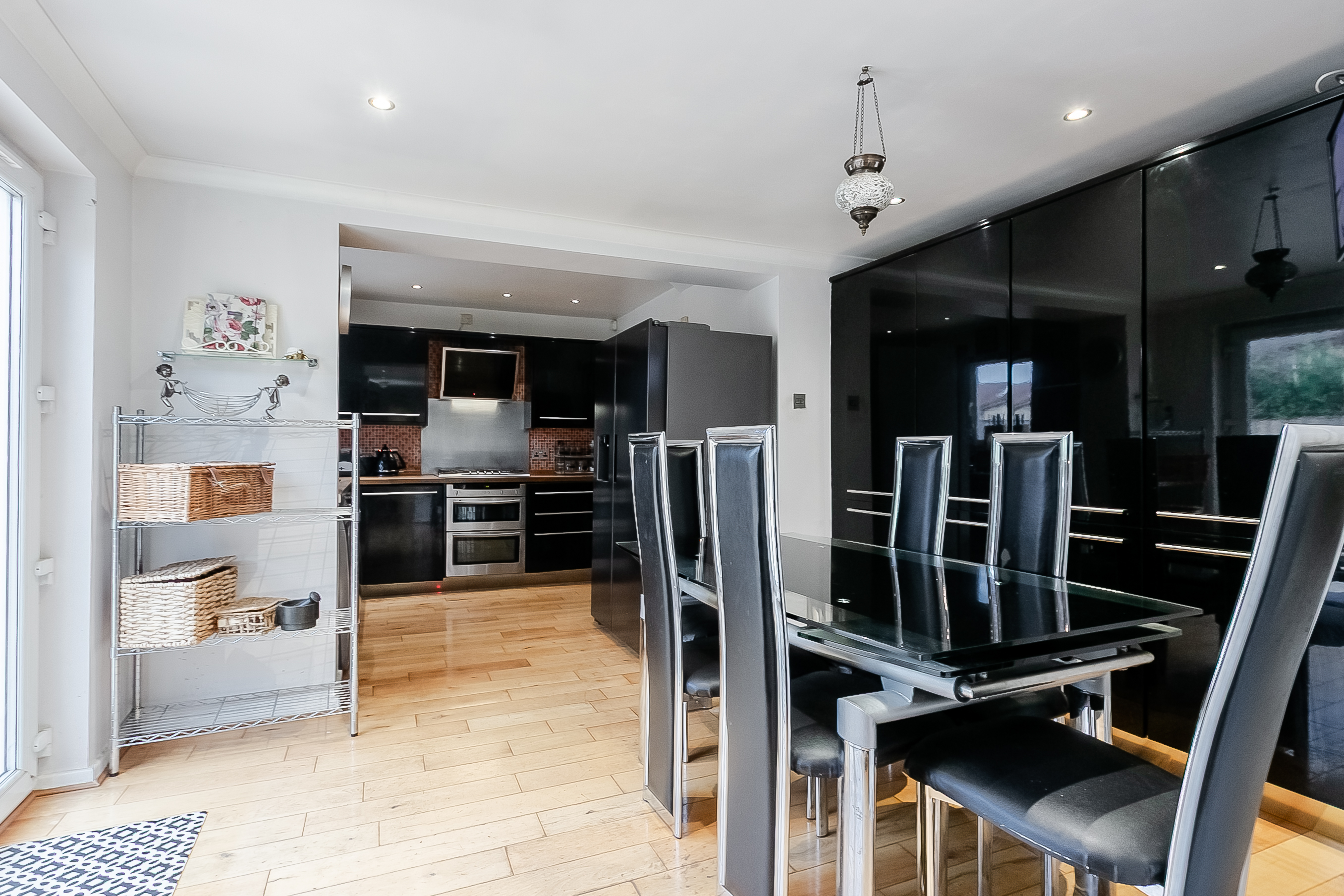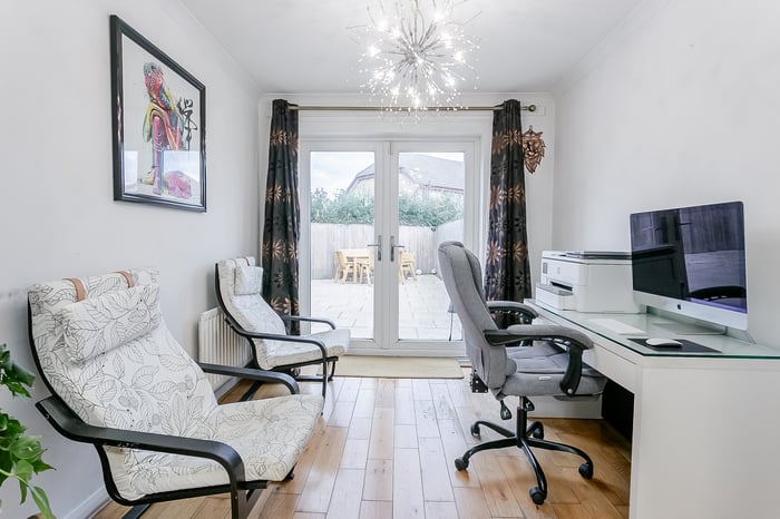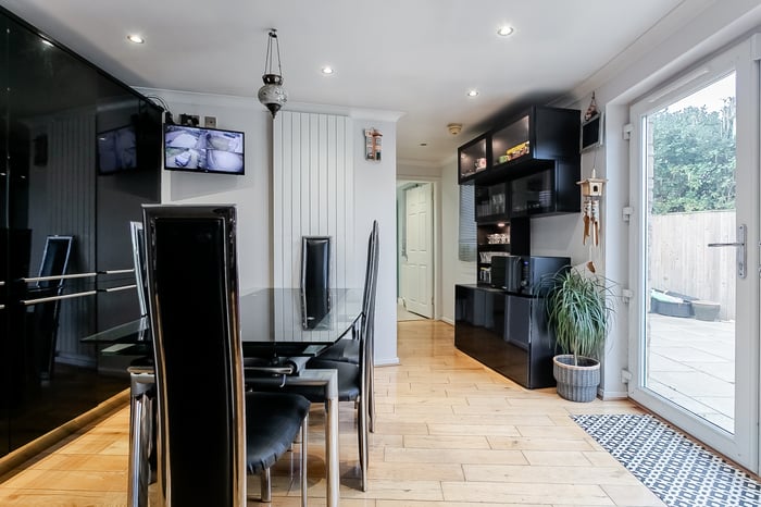 A welcoming entrance opens into the main hallway, providing access to most of the ground-floor accommodation, along with a convenient WC and a useful storage cupboard. To the front of the property, the bright and generously proportioned dual-aspect living and dining room creates an impressive open-plan space, further enhanced by French patio doors to the rear, opening directly onto the expansive patio garden.