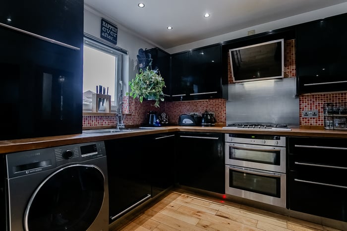 To the rear, the stylish fitted kitchen is finished with real-wood worktops, tiled splashbacks and a sink with a drainer and a spray pull-tap. Appliances include an integrated double oven, a 5-ring gas hob, a dishwasher, and a freestanding washing machine, with the American-style fridge/freezer available by separate negotiation.