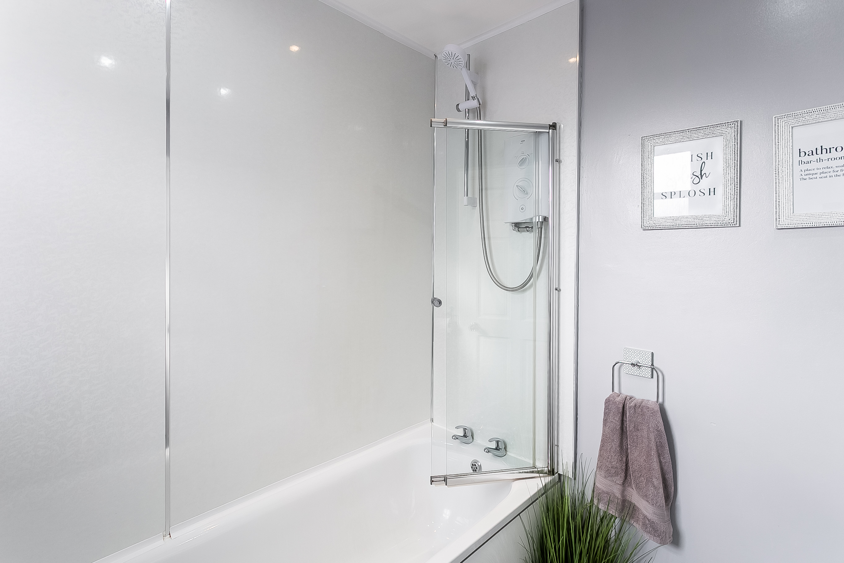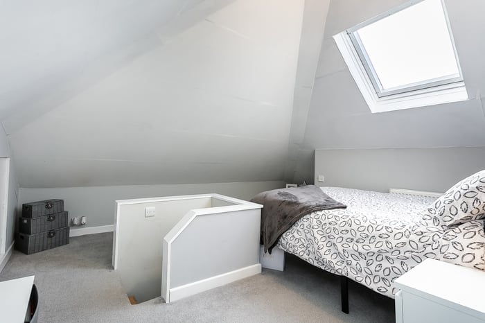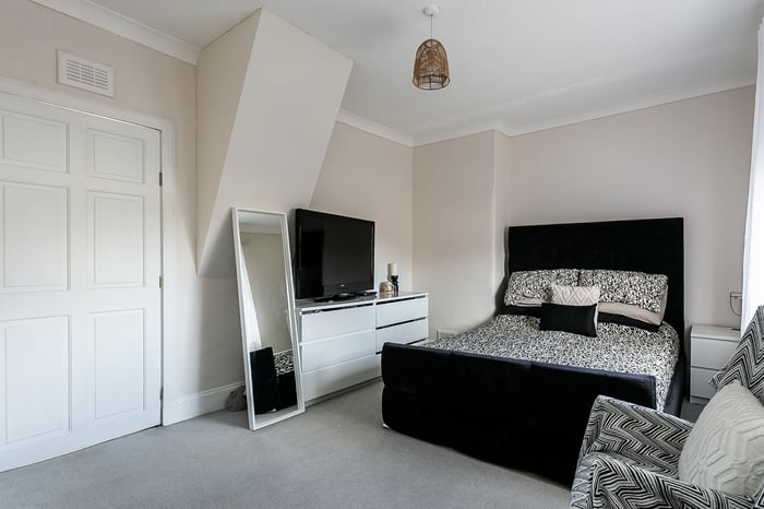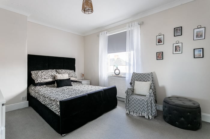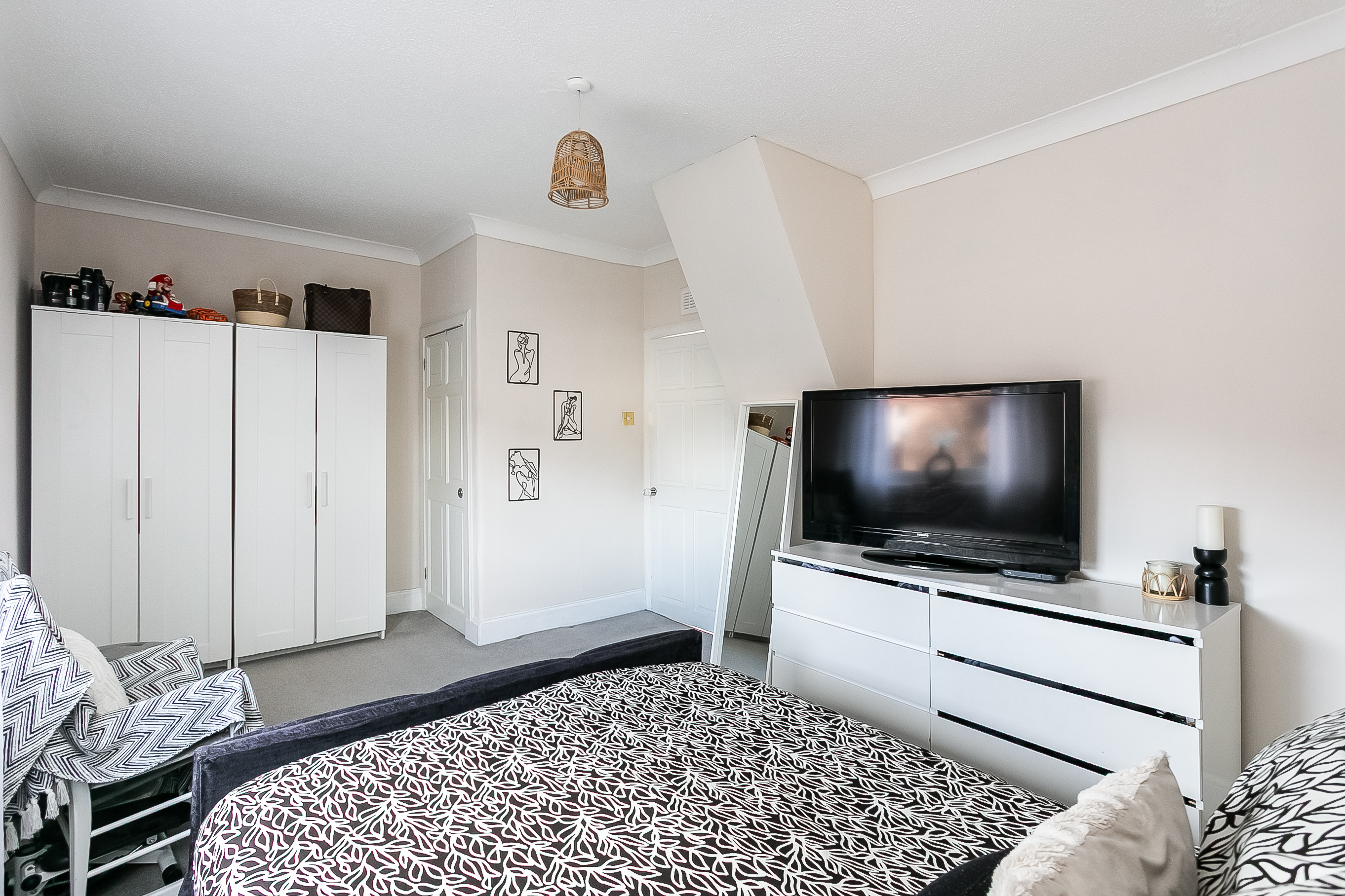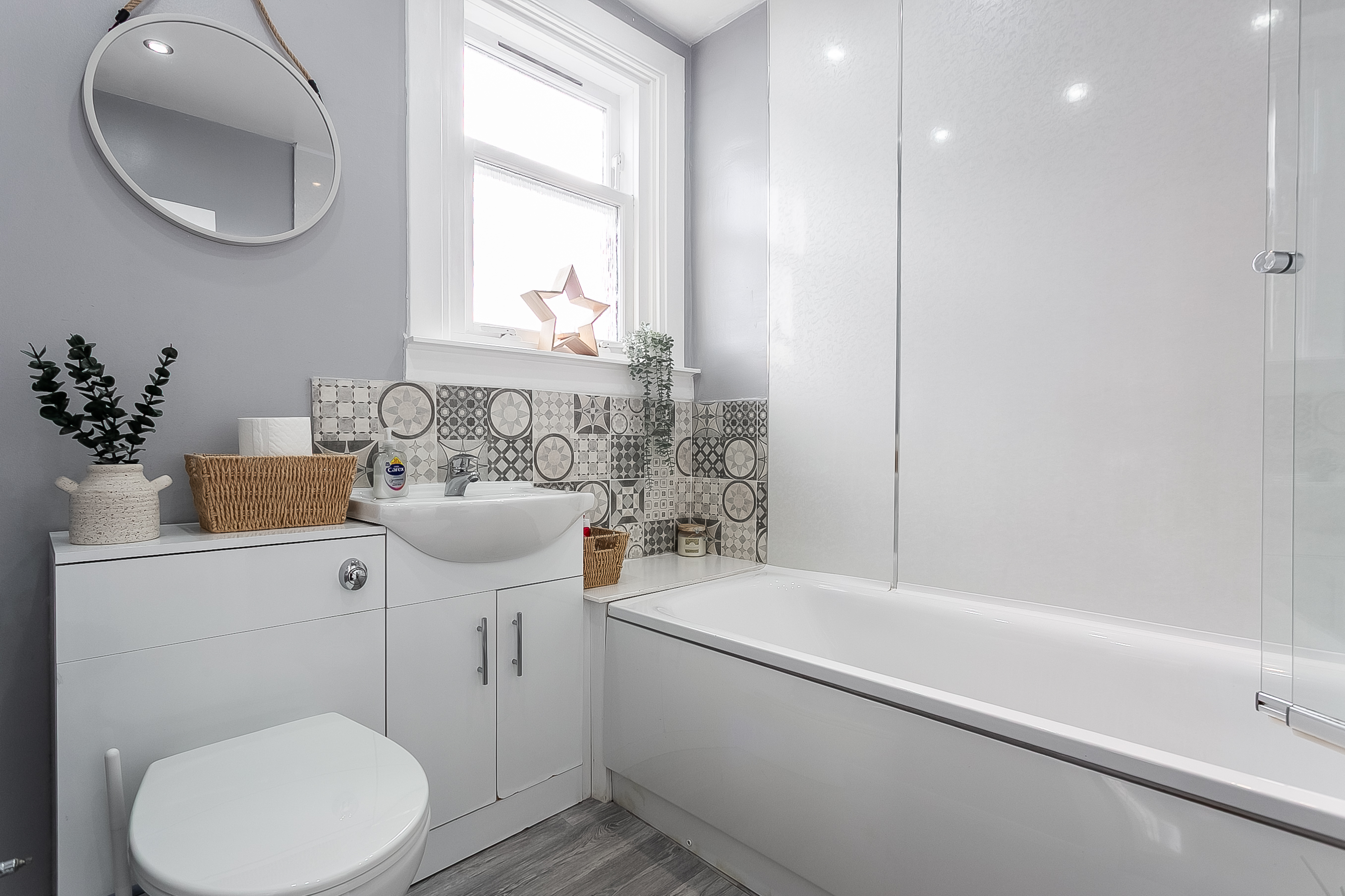 The principal bedroom further benefits from a built-in wardrobe. A modern family bathroom completes the accommodation, fitted with a three-piece suite including a shower over the bath, partially tiled and panelled splash areas, and a contemporary ladder-style radiator.