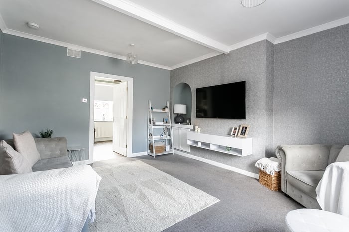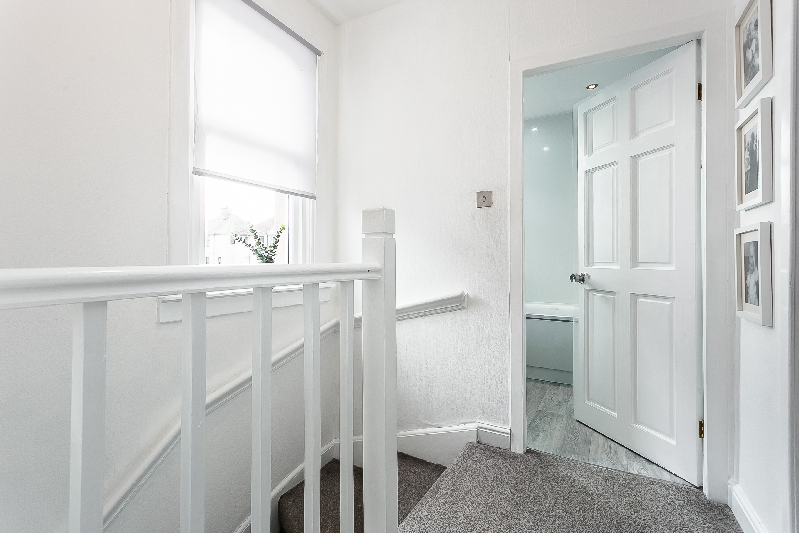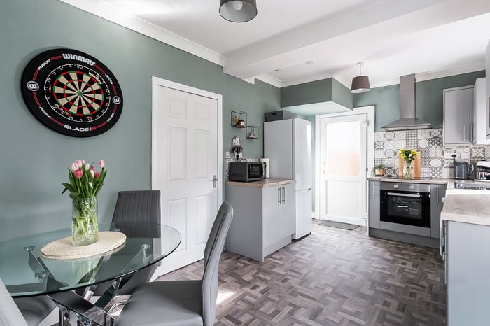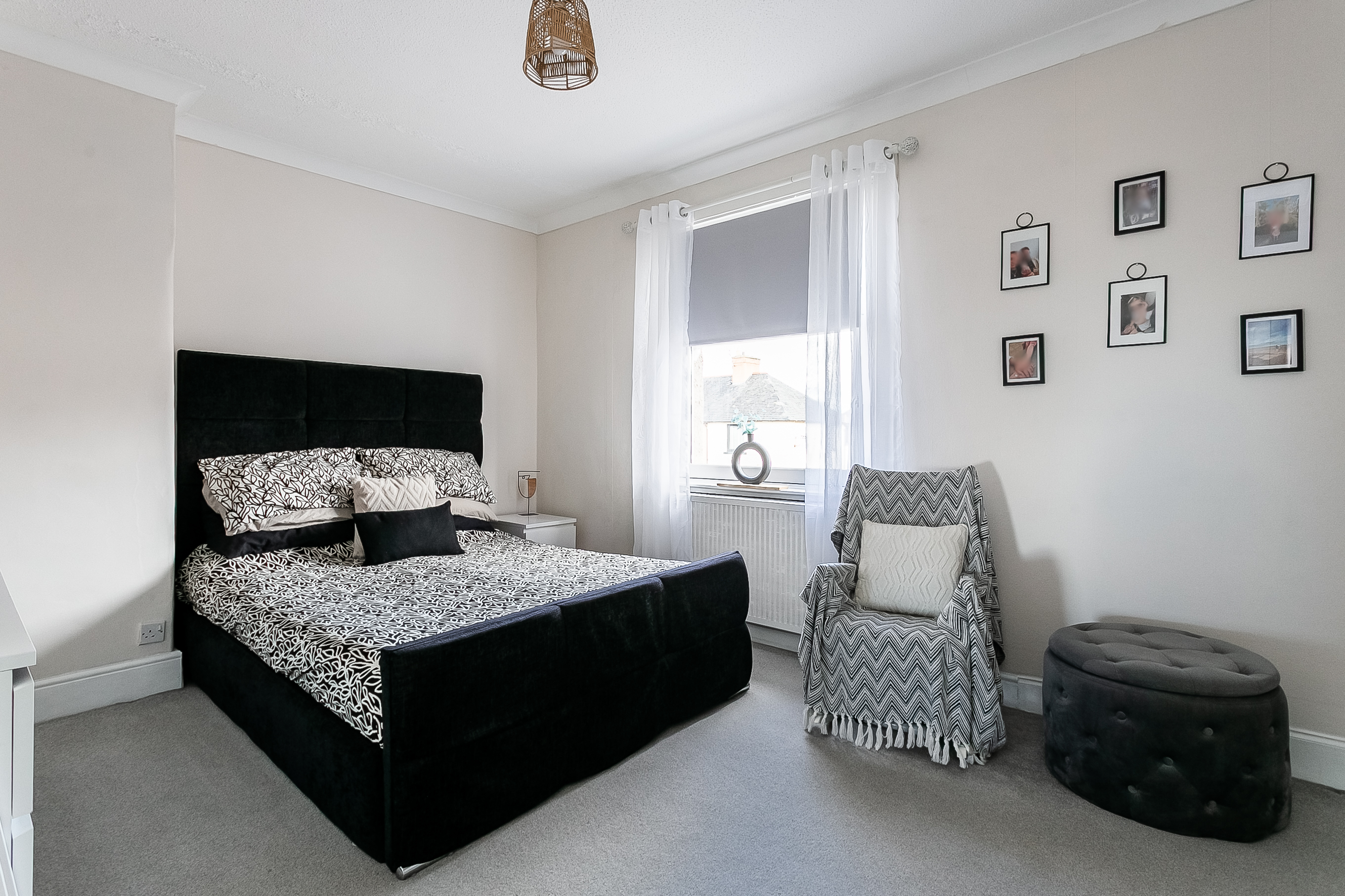 There is ample room for dining, a built-in understair storage cupboard, and a convenient side door offering direct access to the garden — ideal for indoor-outdoor living. Upstairs, the property hosts two well-sized double bedrooms, both finished with carpeted flooring and offering excellent space for a range of furnishings.
