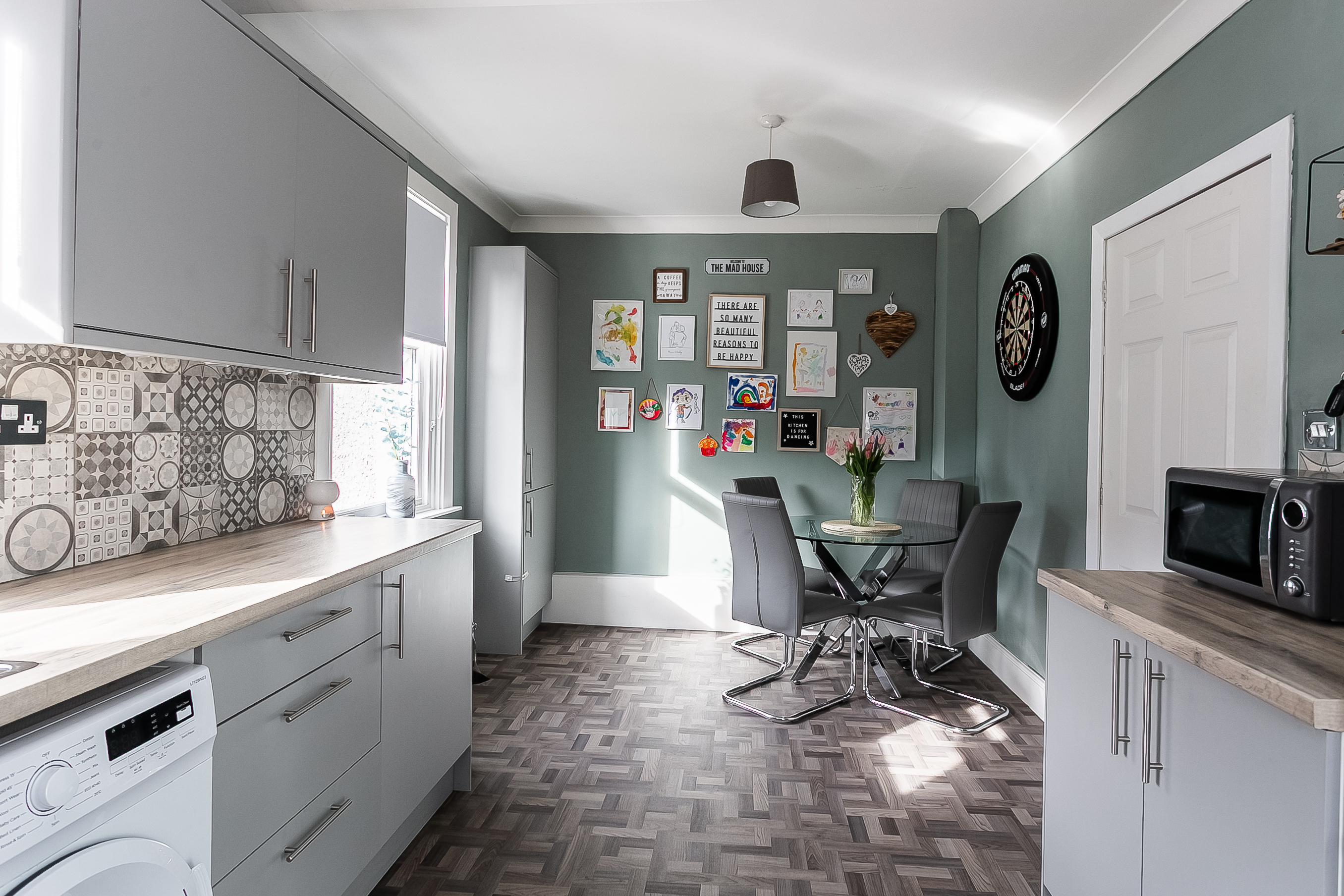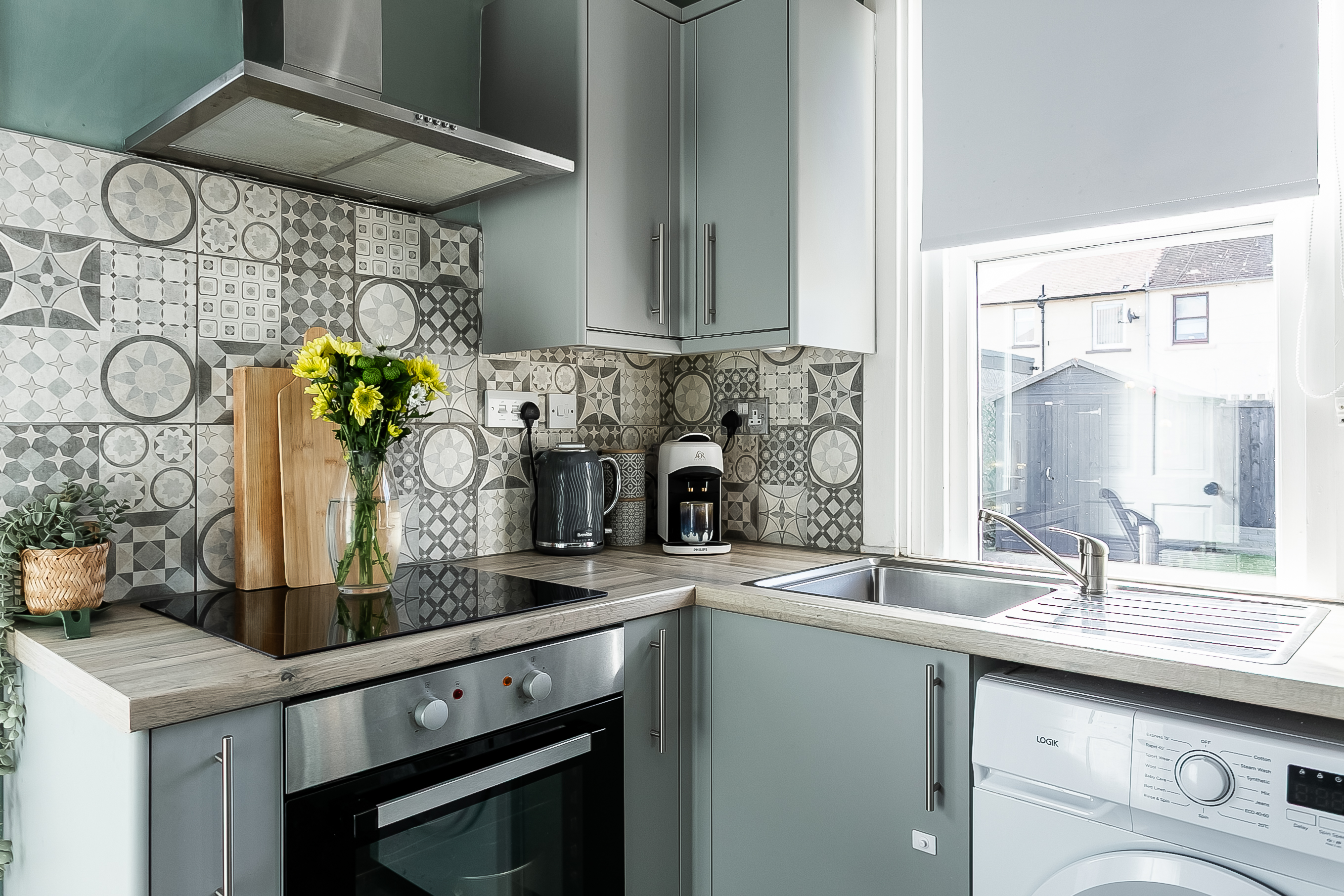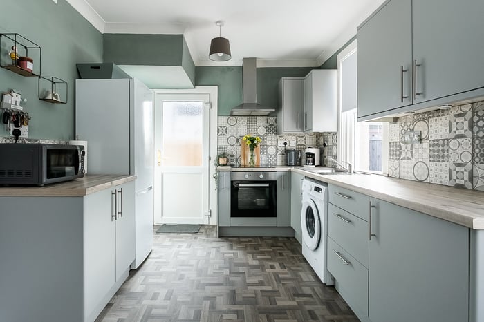 Located off the lounge, the well-proportioned kitchen is fitted with contemporary units, wood-effect worktops and a tiled surround. It includes a sink with a drainer, an integrated hob and oven, and a freestanding fridge/freezer and washing machine.