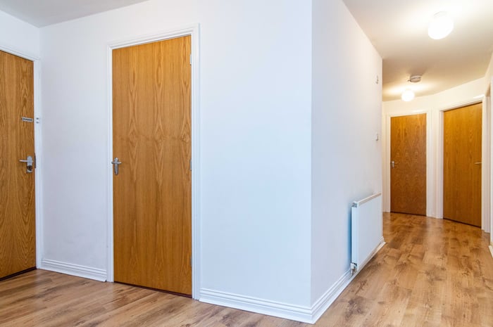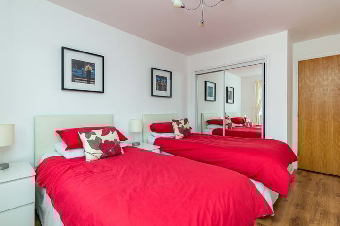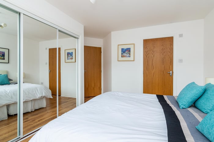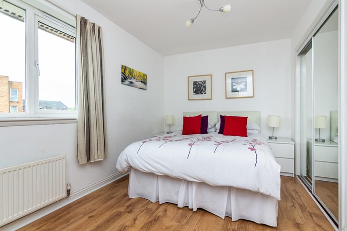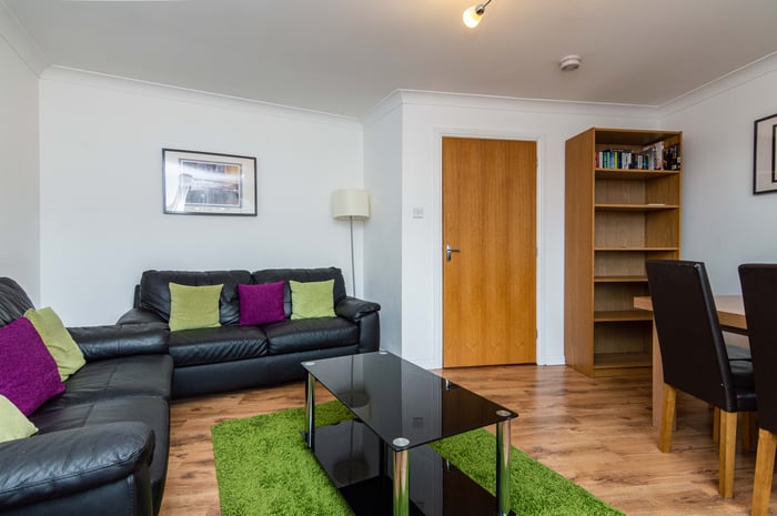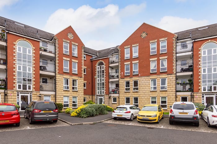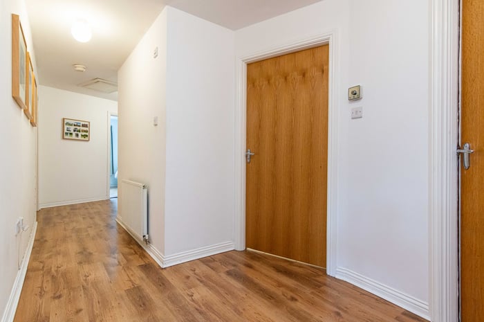 Spacious, bright and well presented, three-bedroom, triple-aspect corner flat on the third (top) floor of a modern, factored apartment block, set in a residential development by Glasgow Green, to the south-east of Glasgow city centre. The entrance hall has laminate flooring, two storage cupboards, a secure entryphone and serves each room within the flat.