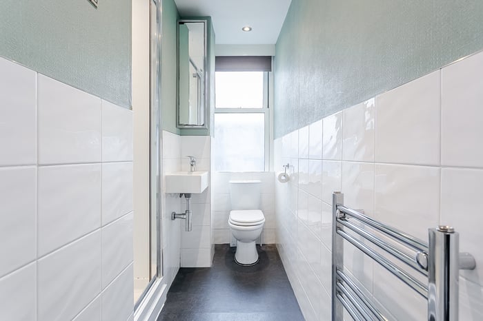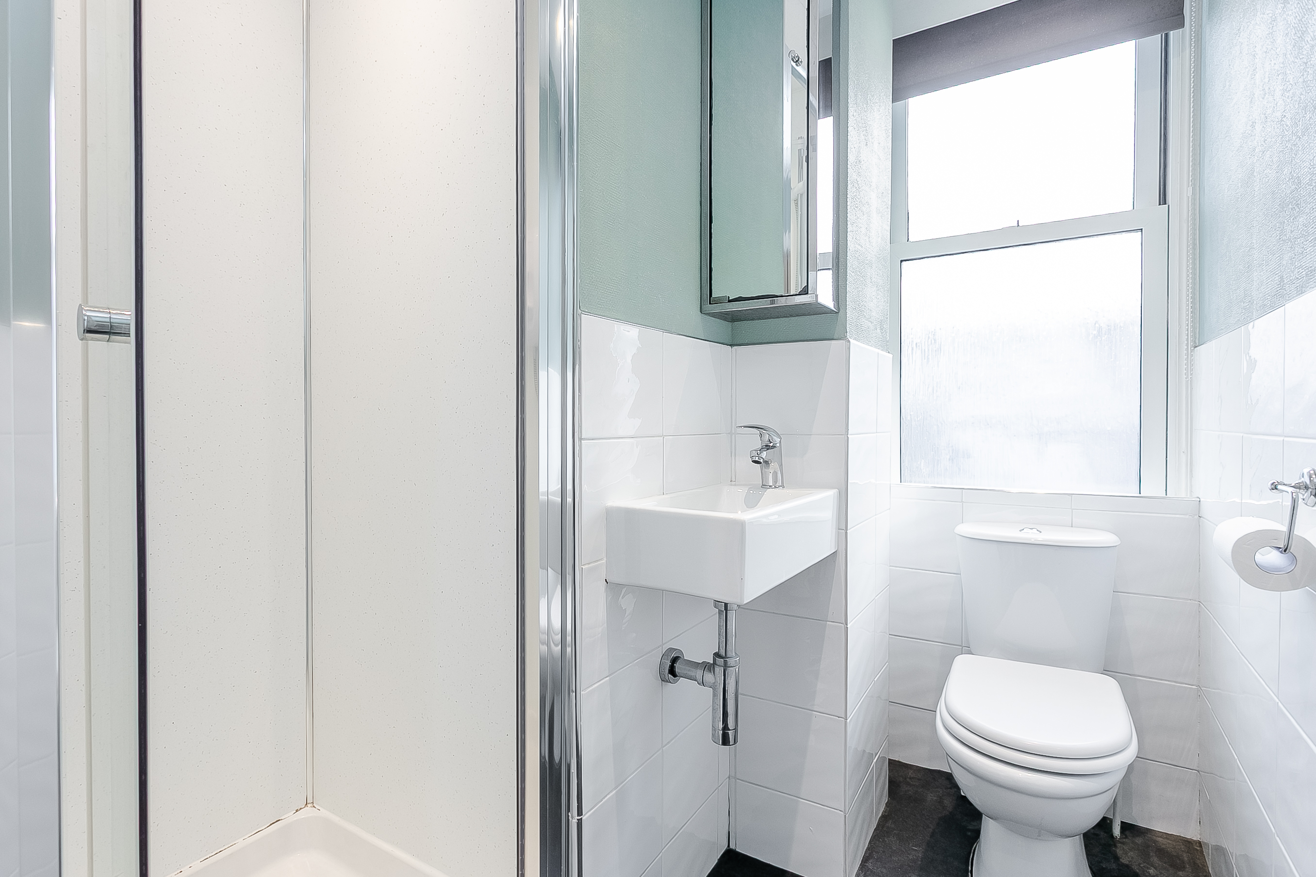 It benefits from soft carpeted flooring, a built-in wardrobe offering ample storage, and a pleasant, peaceful outlook, making it an ideal retreat at the end of the day. Completing the property is the modern fitted shower room, which features easy-maintenance flooring, a tiled splashback surround, contemporary spotlighting and a ladder-style radiator, creating a clean and functional finish throughout.