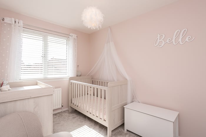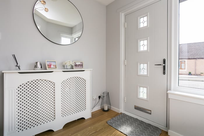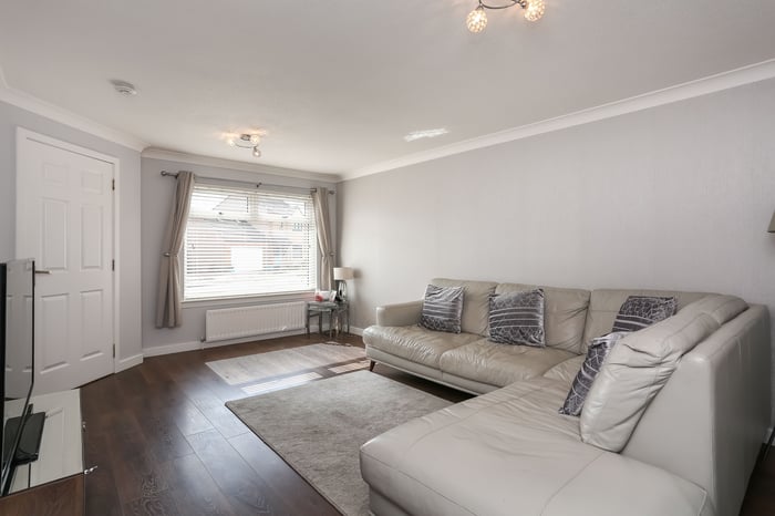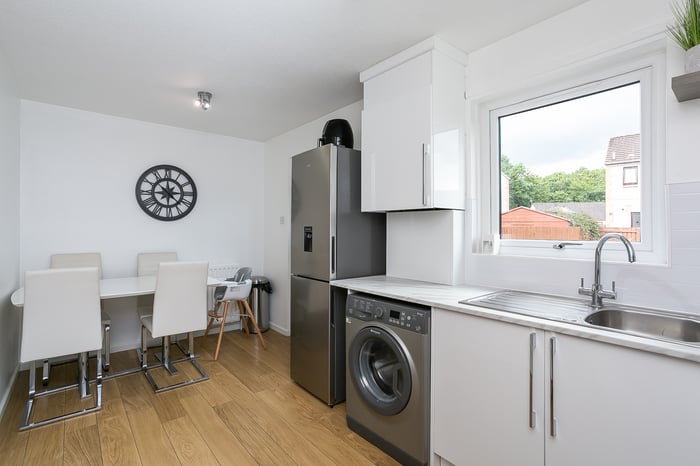 Immaculately presented, three-bedroom, semi-detached family home, with gardens and a driveway. Set in a quiet residential development, in the coastal village of East Wemyss, Fife. A bright entrance hall leads into a spacious living room on the left, filled with natural light, from a wide, southeasterly-facing window.