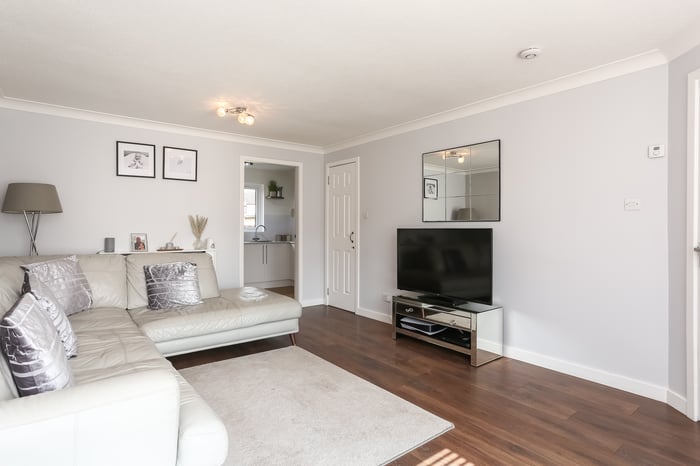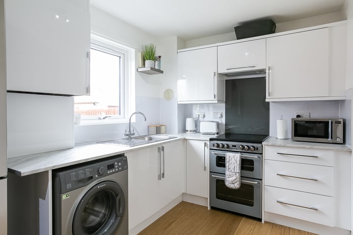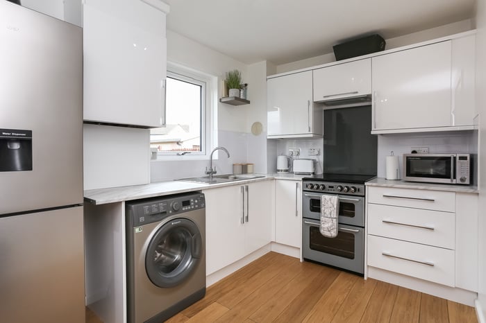 Finished with light, neutral decor and modern, wood effect flooring, the well-presented reception room includes built-in storage and provides ample space for freestanding, lounge furniture. Accessed directly from the living room, a kitchen is fitted with gloss-white units and marble-effect worktops, and includes a freestanding cooker, a fridge/freezer and a washing machine.
