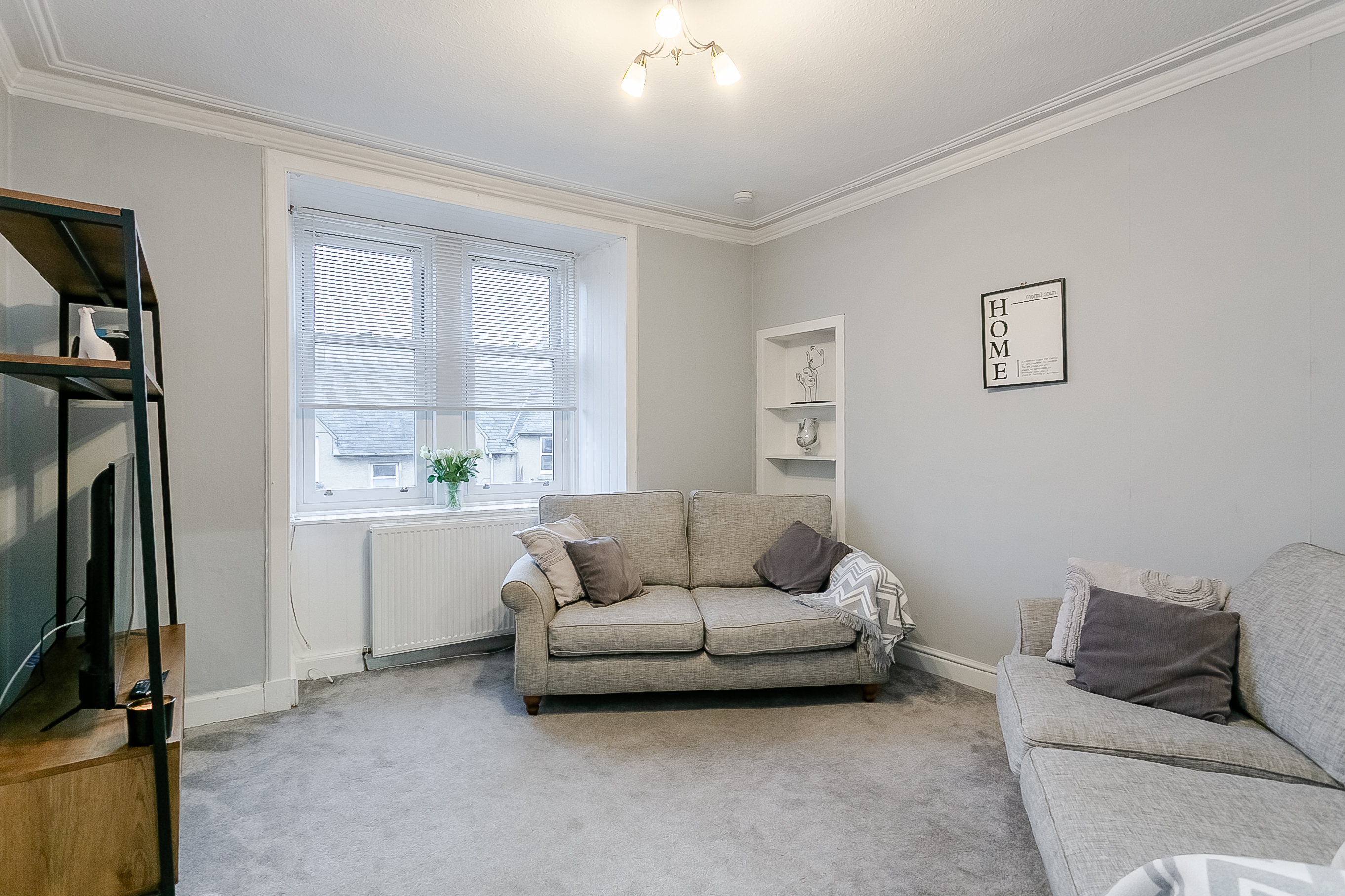 The soft carpeted flooring adds warmth and comfort underfoot, while the central light fitting creates a cosy atmosphere in the evening. With ample space for both relaxing and dining furniture, this versatile room is ideal for unwinding after a long day or entertaining guests.