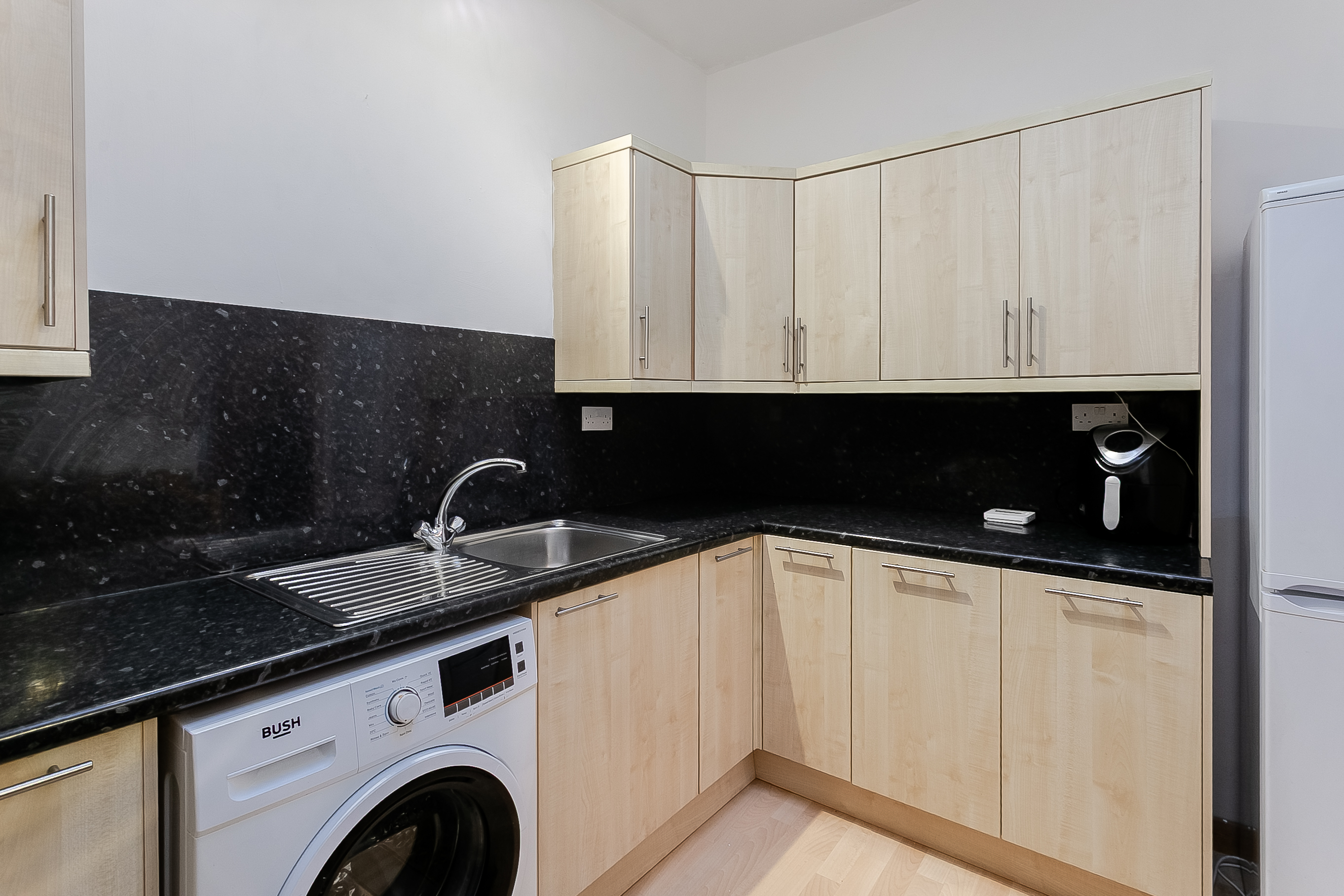 Accessed via the lounge, the fitted kitchen features wood-effect flooring complemented by stone-effect worktops and a coordinating splashback, creating a stylish and practical workspace. A skylight draws in additional natural light, making the room feel airy and open.