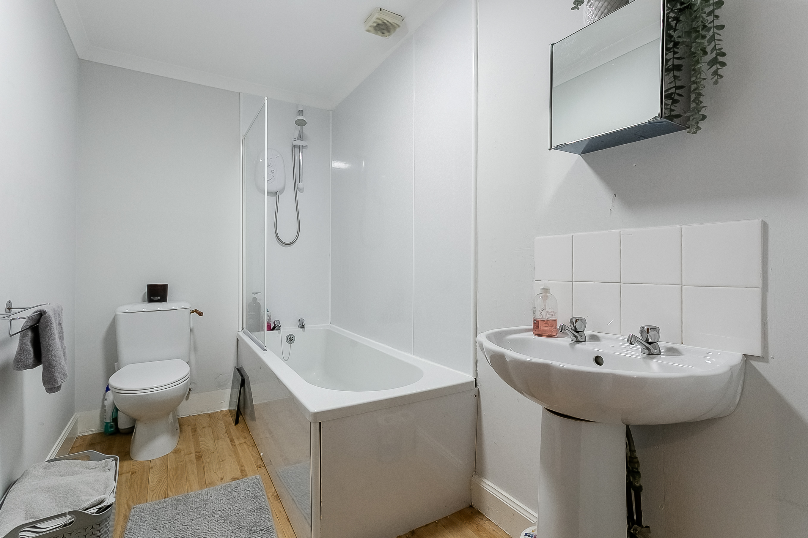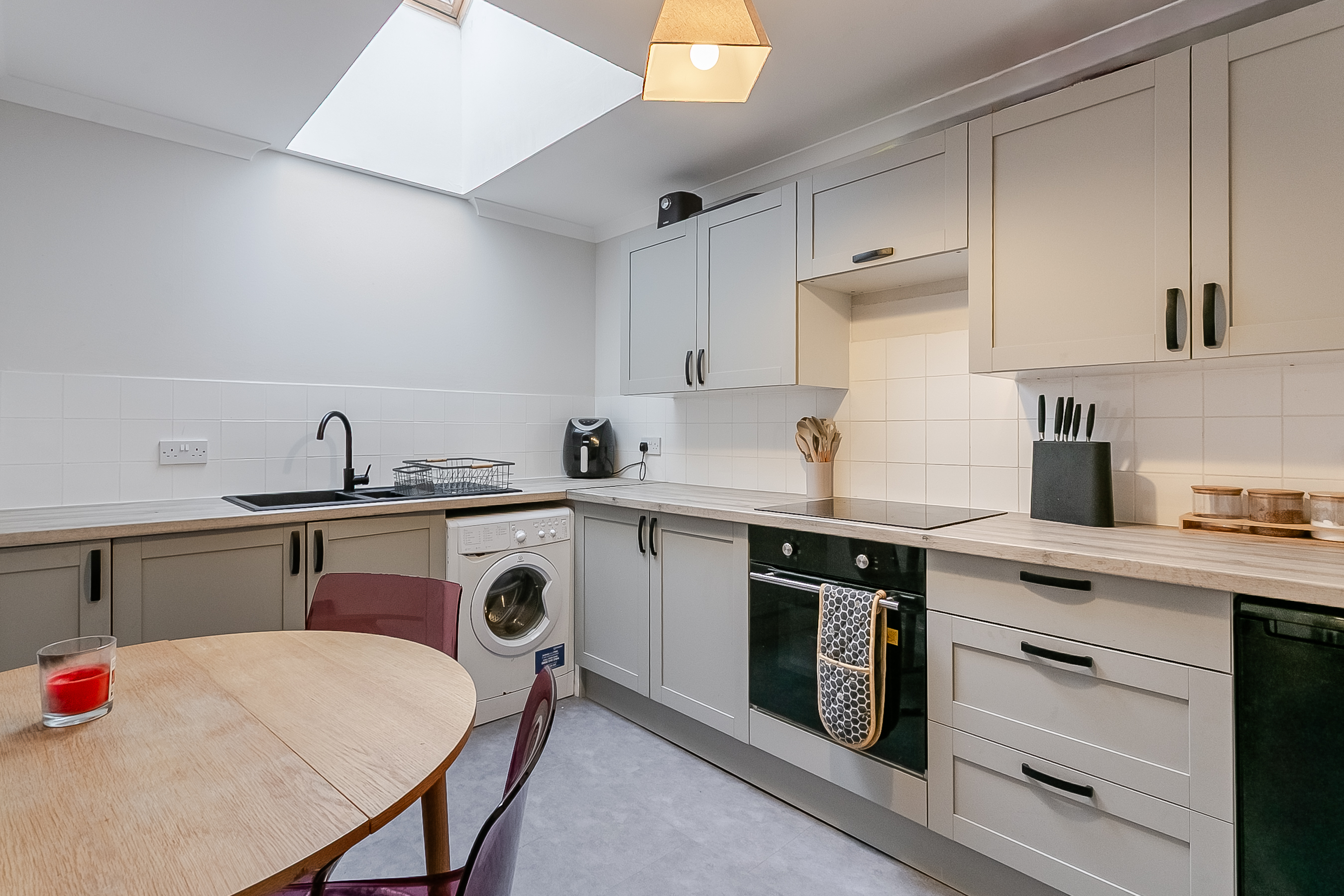 The kitchen is to the front, also with a skylight window, with modern fitted units including wood effect worktops, a tiled surround, a sink with a drainer, an integrated oven and electric hob, and a freestanding fridge/freezer and washing machine. Completing the ground floor is a spacious family bathroom, fitted with a three-piece suite comprising a bath with a shower over and tiled splash walls.