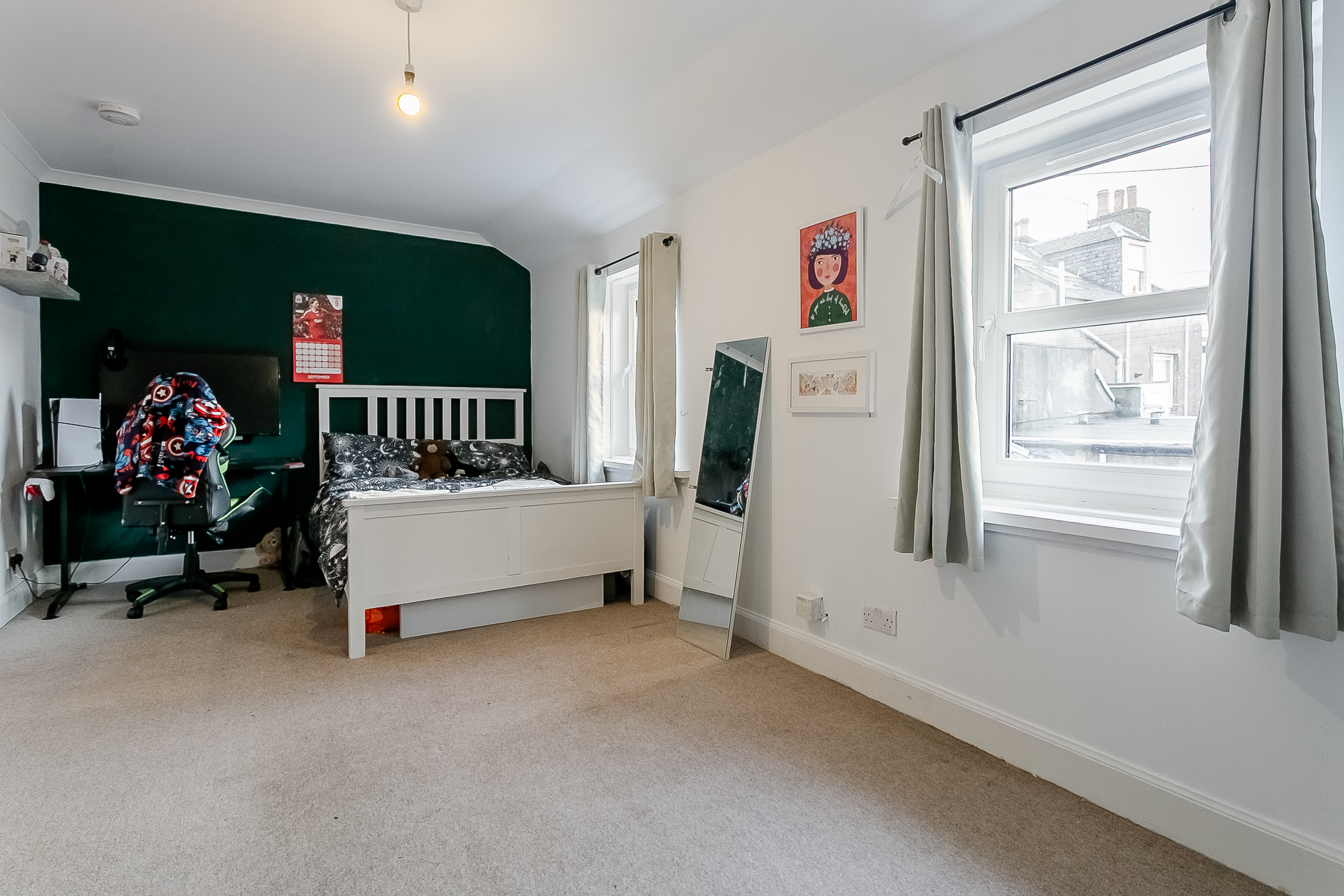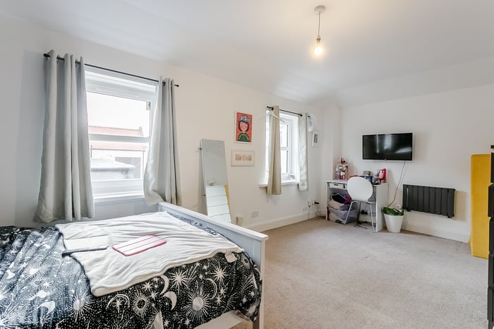 Upstairs, the generous main bedroom is positioned to the front and offers ample space for furnishings, twin windows, carpeted flooring and a wall-mounted TV point. The second bedroom sits to the rear, with light decor and carpeting.