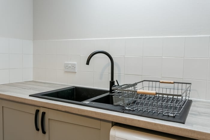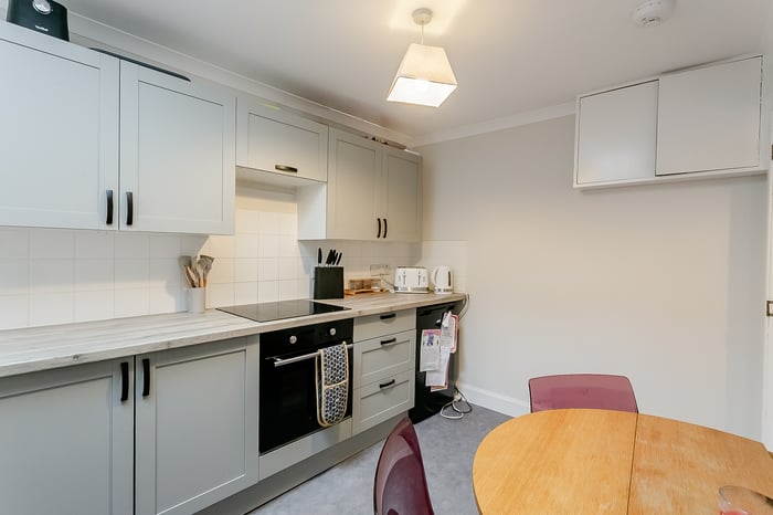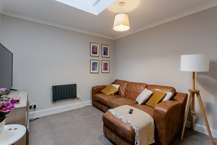 Tastefully presented and flexible two-bedroom, main-door upper flat, accessed via the shared garden. Quietly yet conveniently located in the heart of the popular town of Tranent, East Lothian. A welcoming entrance hall leads into the ground-floor accommodation. Set to the rear, the tastefully presented living room enjoys a skylight window, light decor and carpeted flooring.