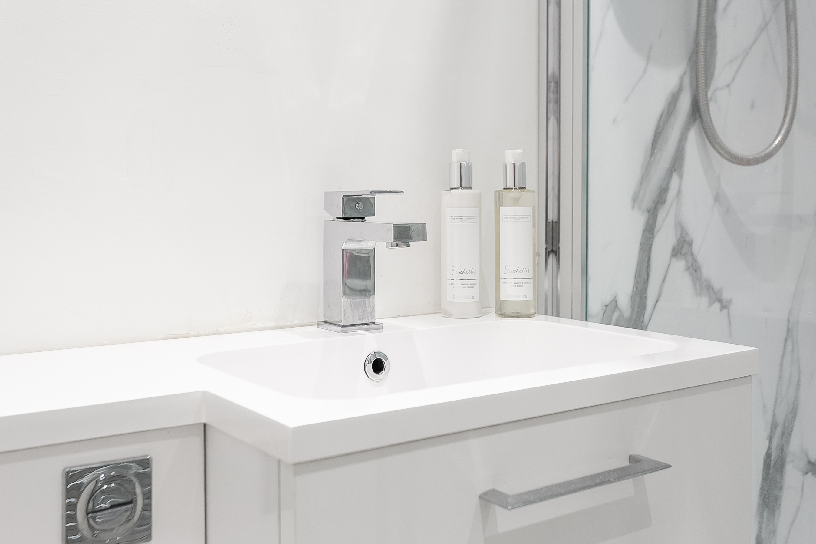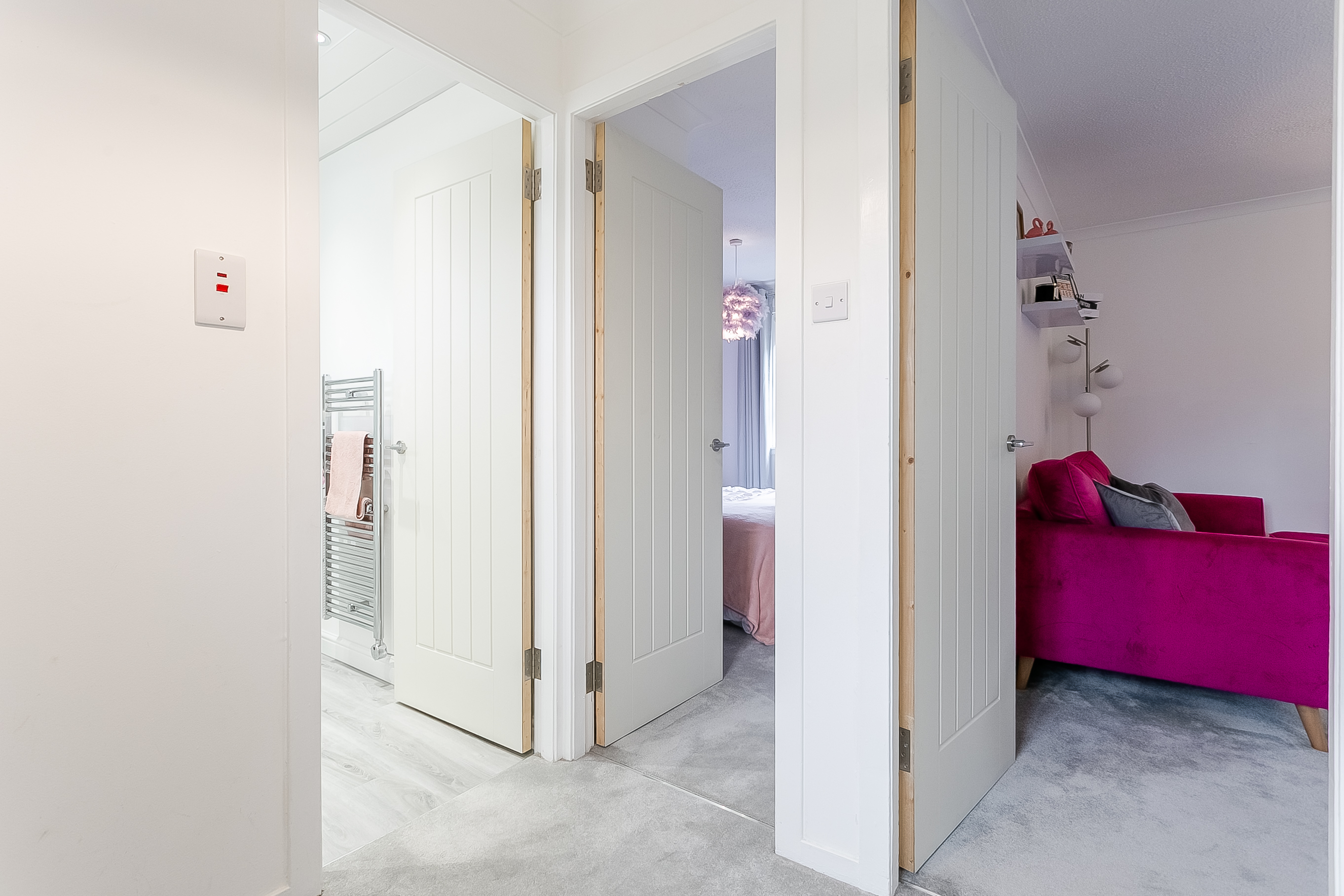 Completing the property, the contemporary shower room comprises a three-piece suite with wood-effect flooring, a marble-effect splashback surround, spotlighting, and a ladder-style heated towel rail, providing a sleek and functional finish.