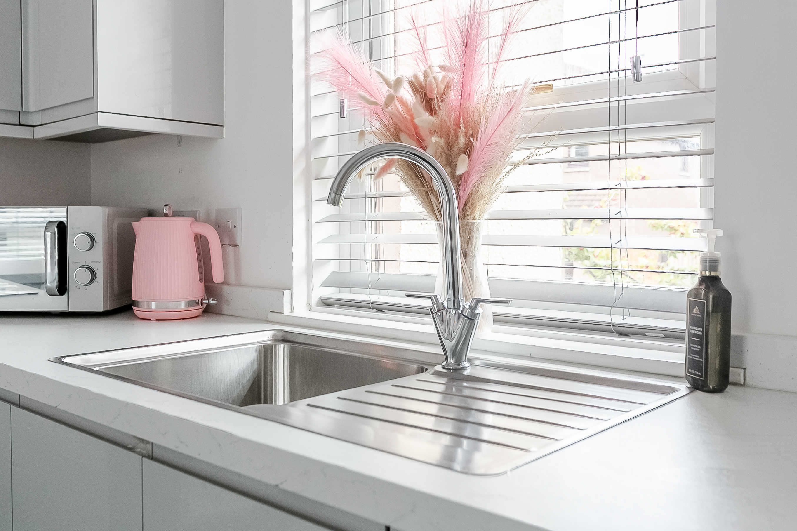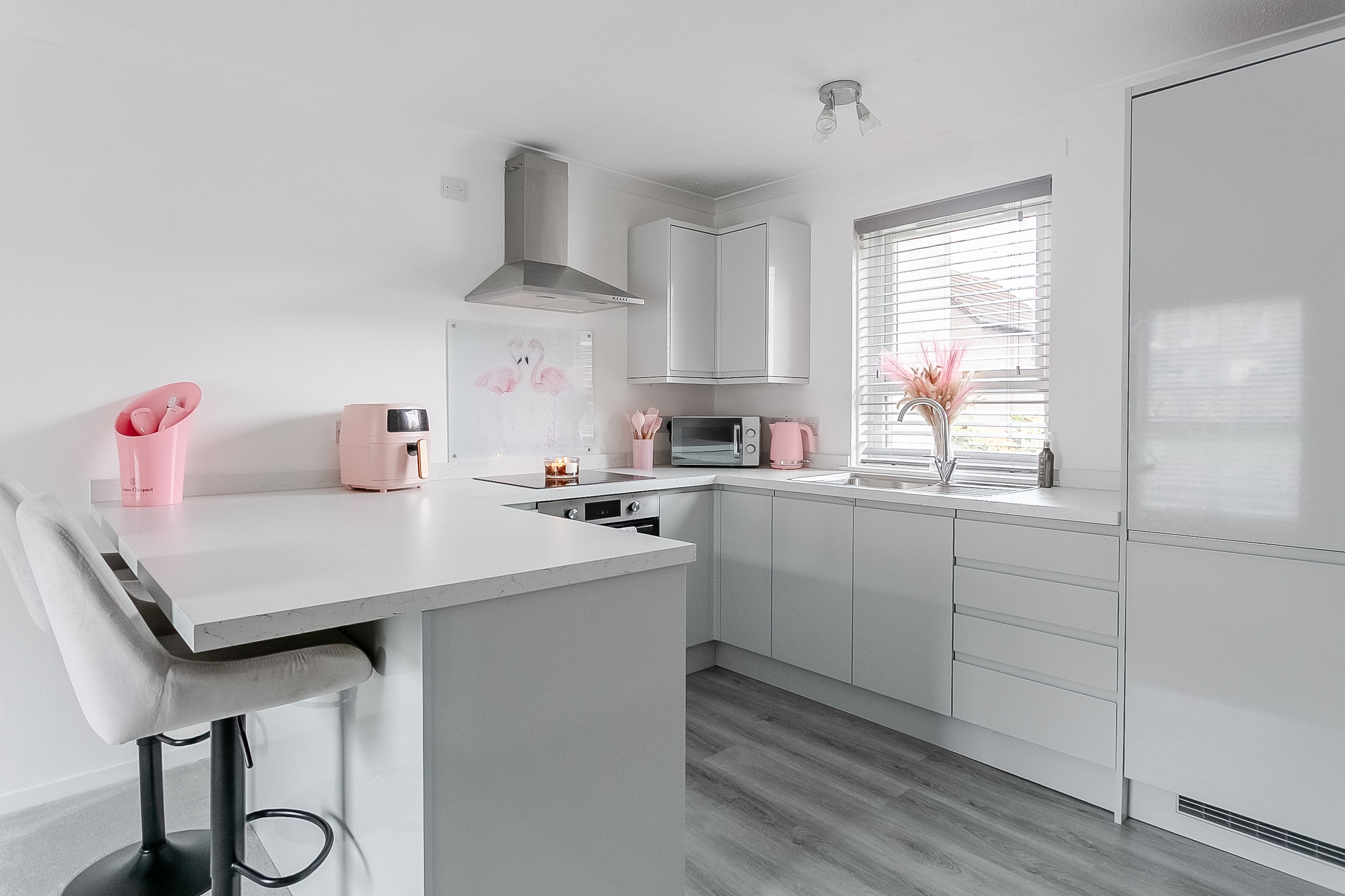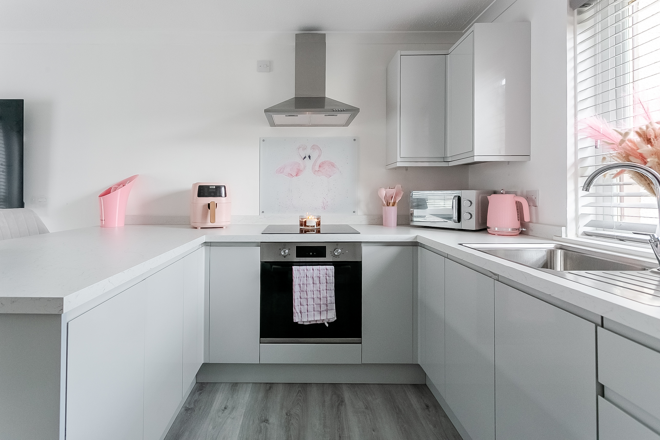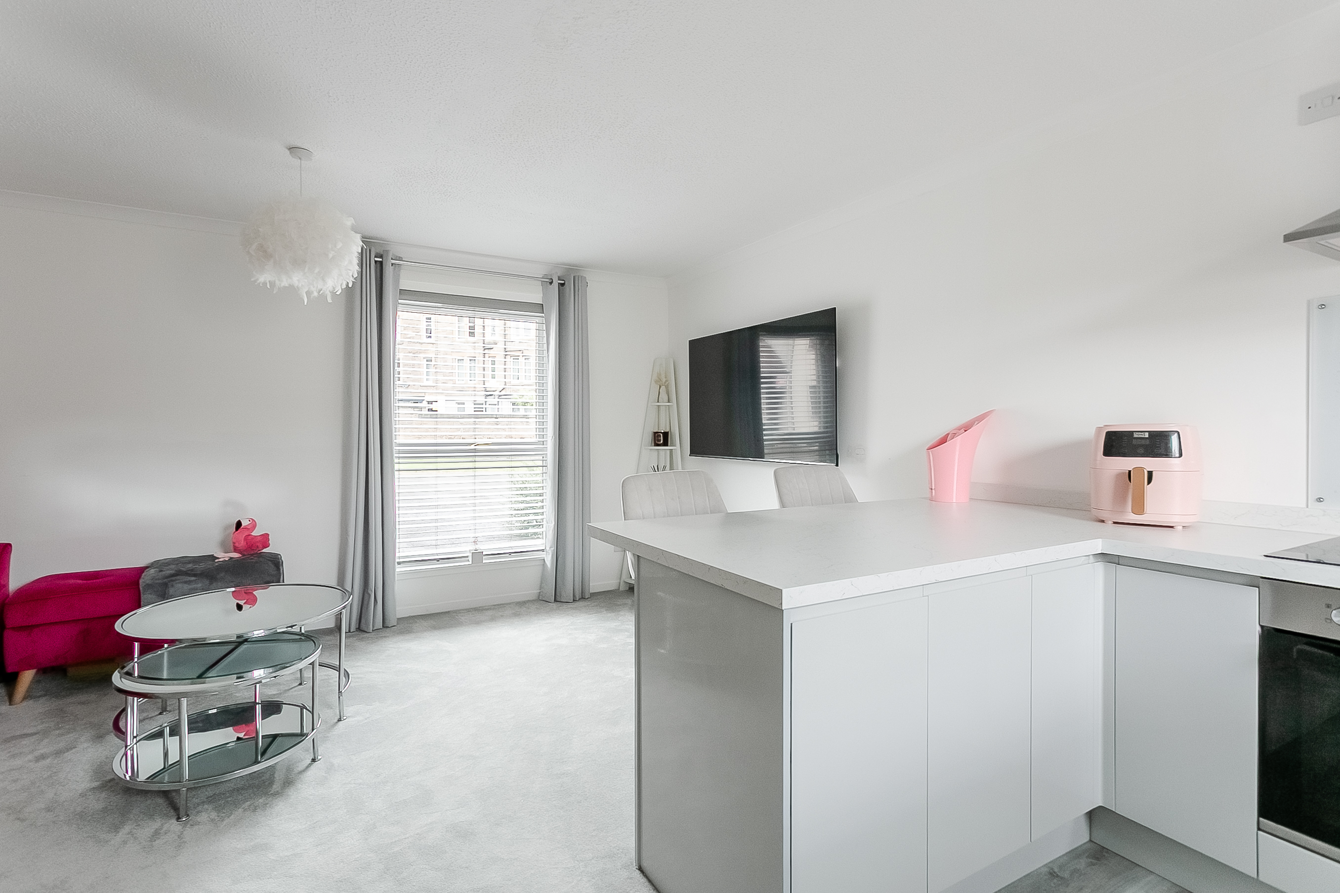 A large window allows natural light to fill the room, creating a warm and comfortable setting for everyday living and relaxation. The modern fitted kitchen is both stylish and practical, offering wood-effect flooring, marble-effect worktops, a stainless steel sink with drainer, and a tiled splashback surround.