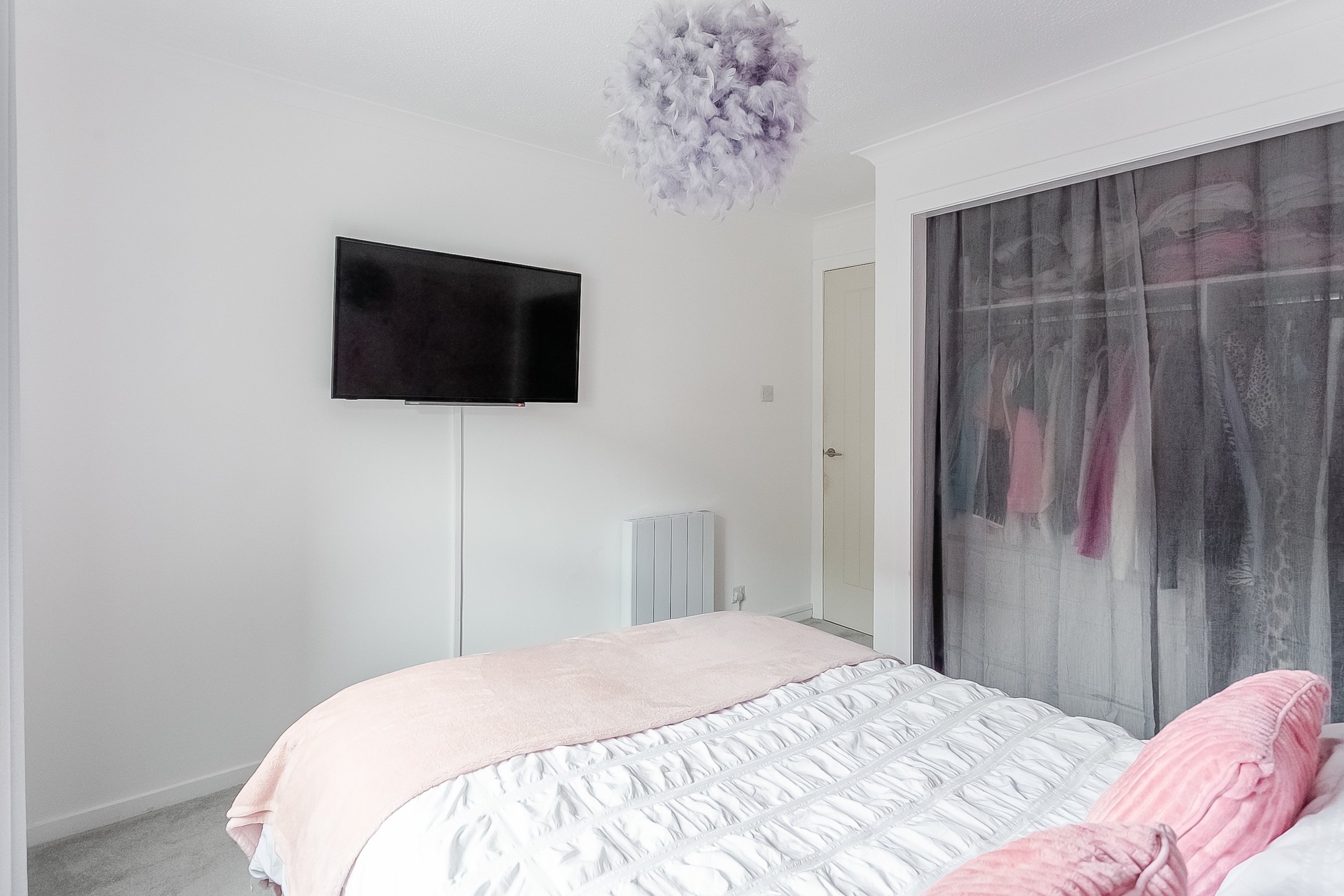 Integrated appliances include a fridge/freezer, washing machine, oven, and induction hob with a canopy extractor above. The generously sized bedroom provides a peaceful retreat, complete with carpeted flooring, a central light fitting, a wall-mounted TV point, and a built-in wardrobe, offering excellent storage while maximising space.