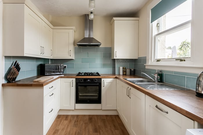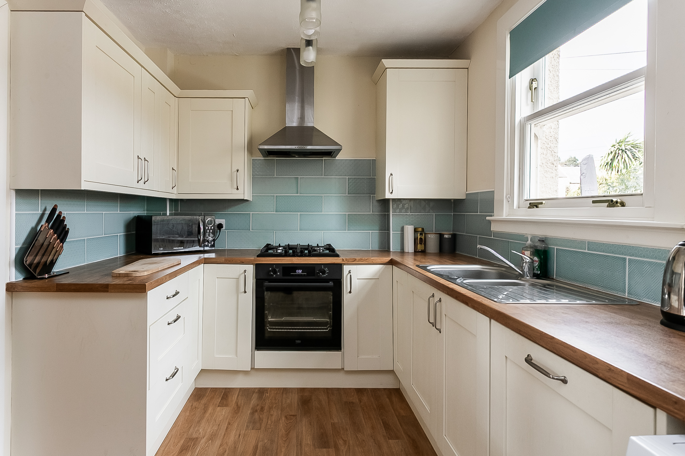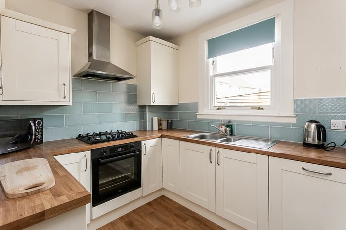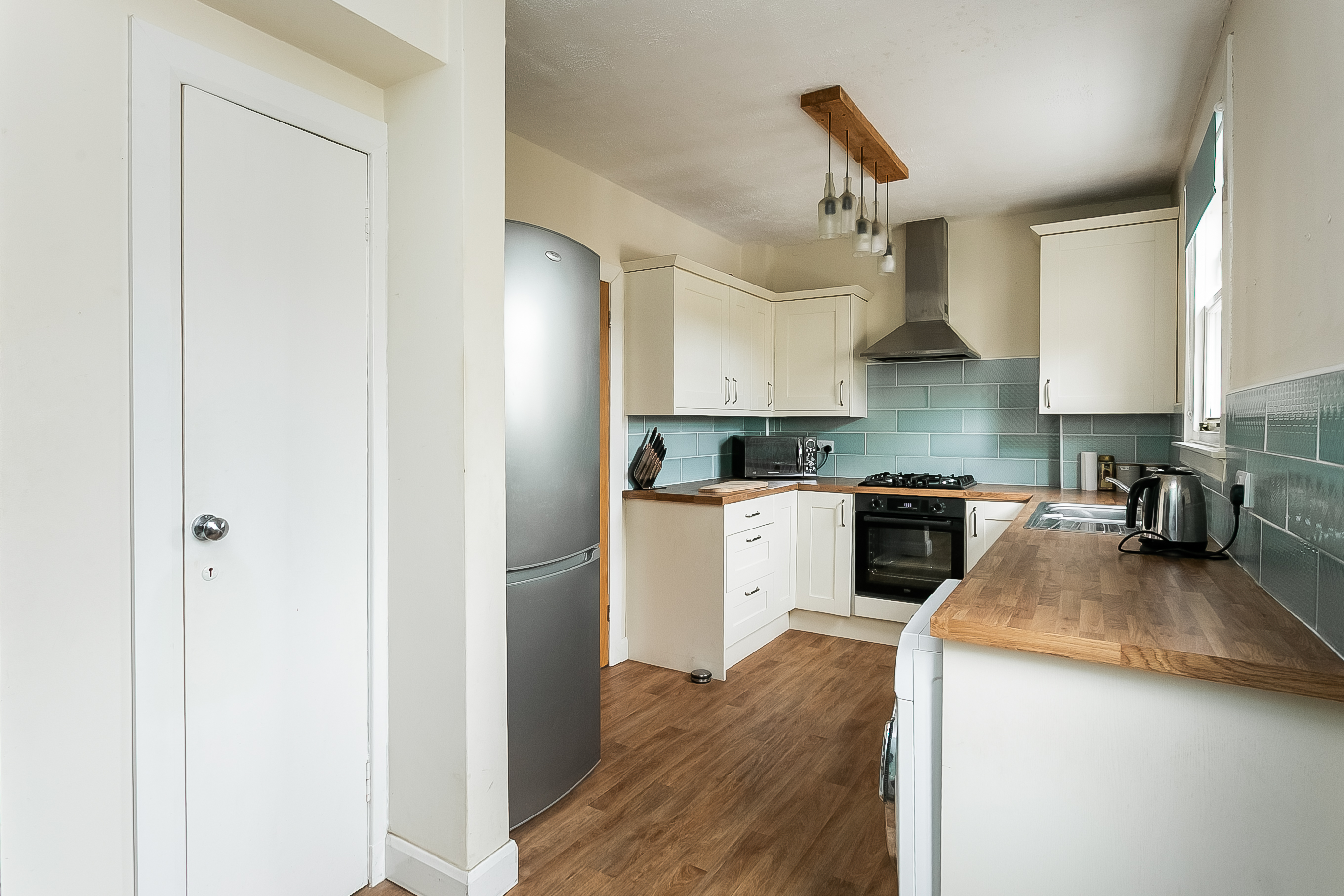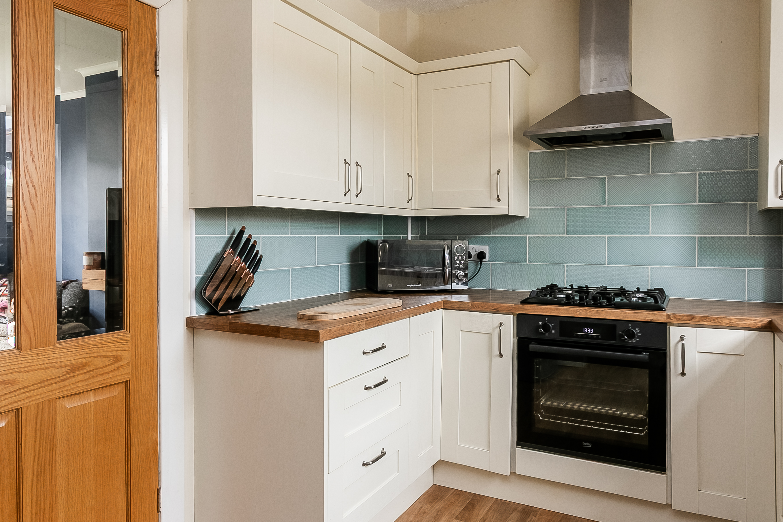 Situated off the living room, the stylish dining kitchen is fitted with modern units, wood-effect worktops, and a tiled surround. It includes a sink with a drainer, an integrated oven, a hob, and a dishwasher, as well as a freestanding fridge/freezer and washing machine.