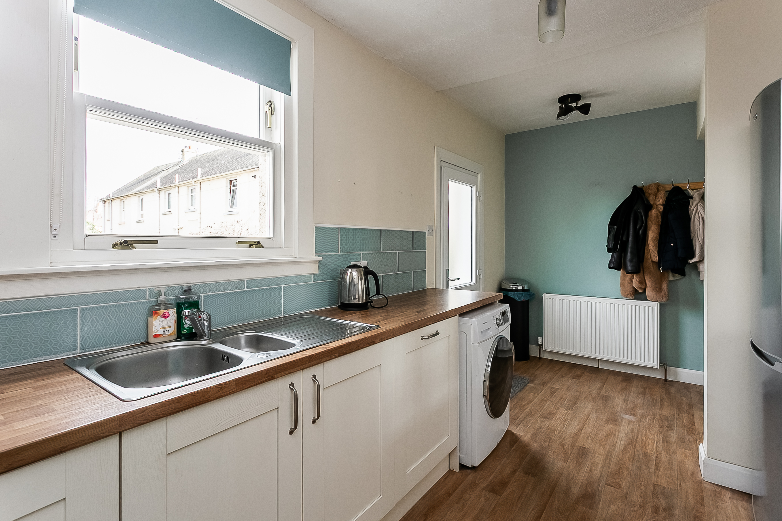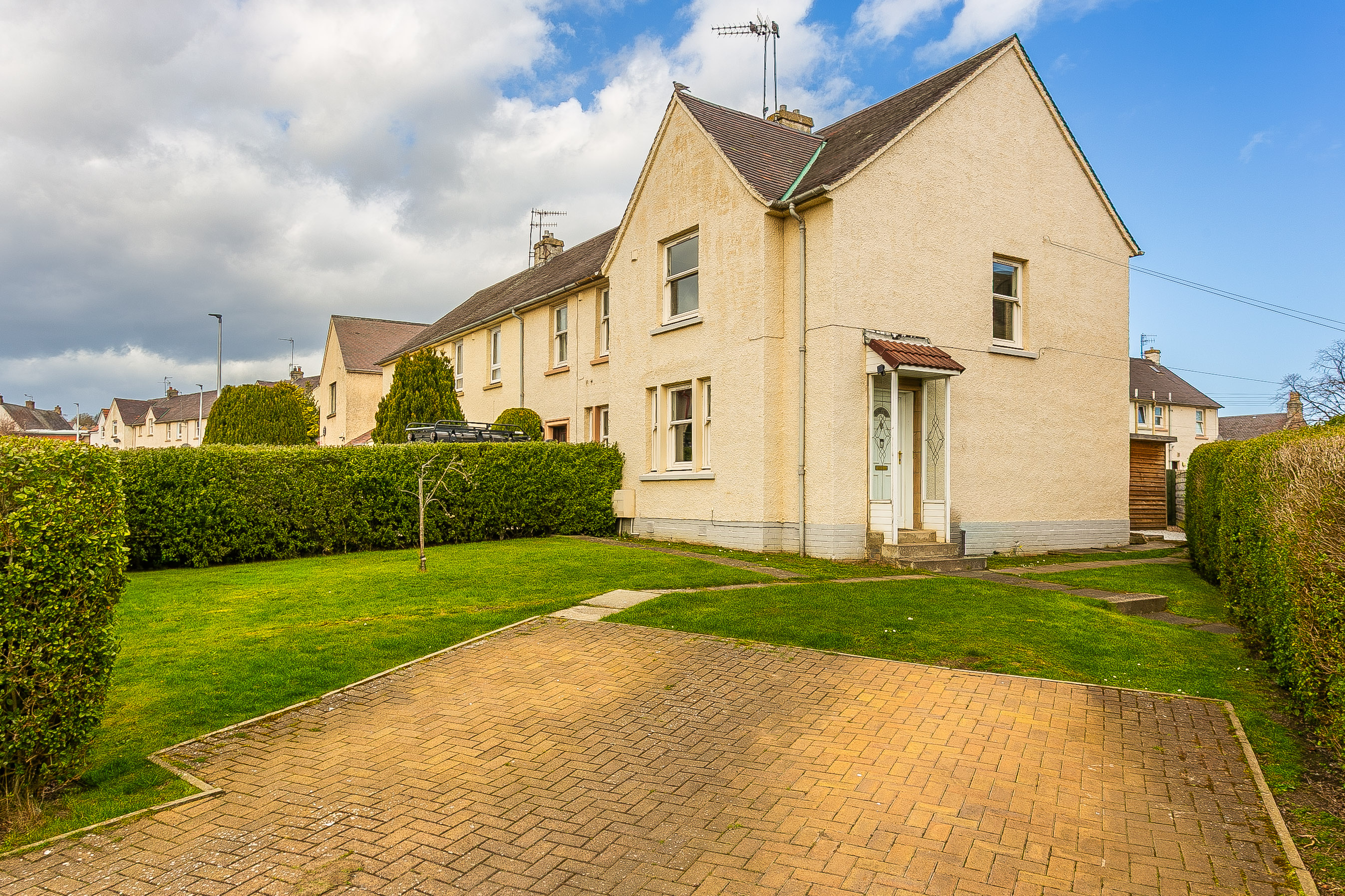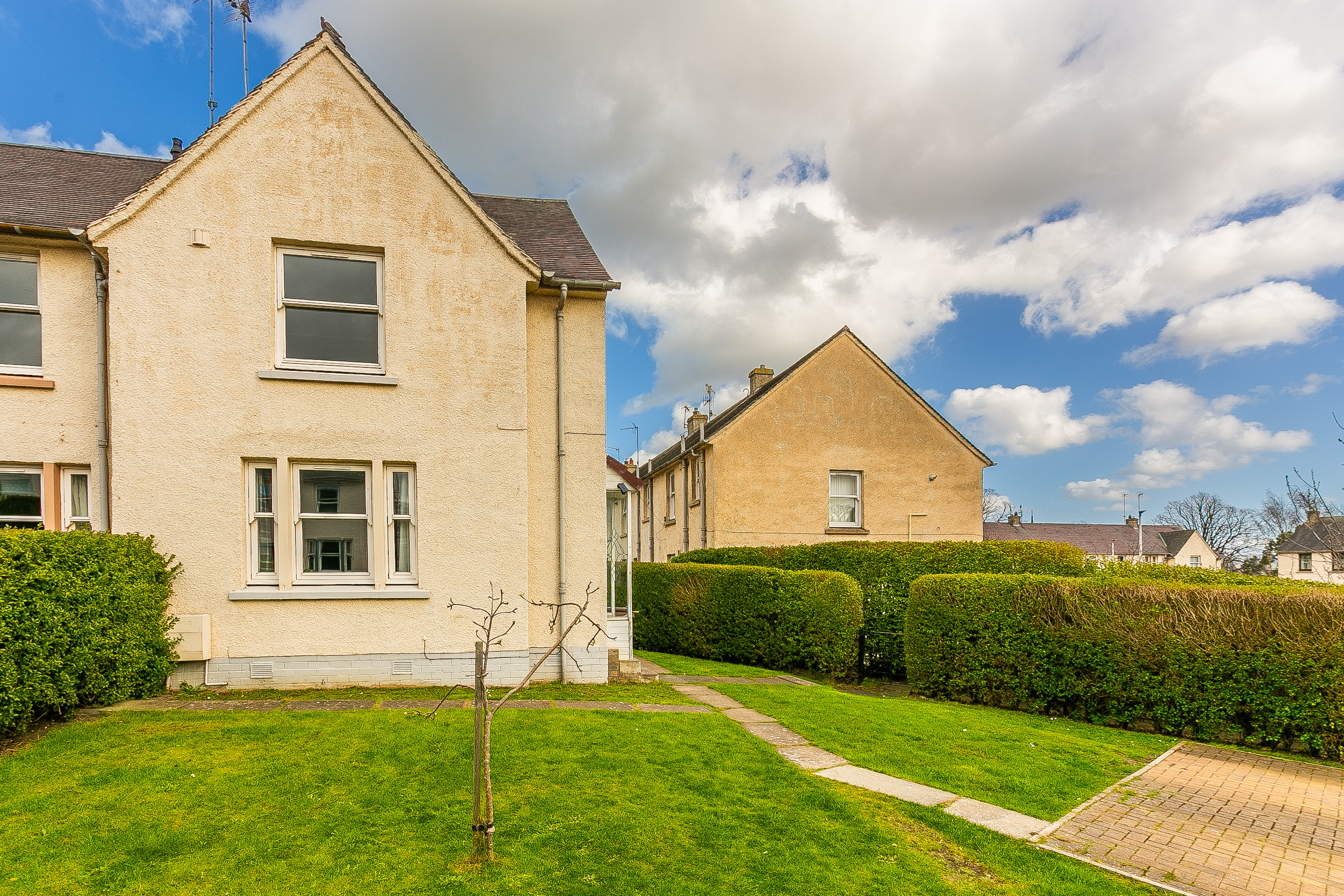 Light, beautifully presented and set on a desirable corner plot, this two-bedroom end-terrace villa offers private gardens and a driveway. Located within a well-established and rarely available residential area of the historic market town of Haddington, East Lothian. A welcoming entrance hall leads into a bright, front-facing living room, enjoying a south-west aspect that fills the space with natural light. Tastefully decorated and finished with carpeted flooring, the room also features a charming wood mantel with space for an electric stove, along with a useful storage cupboard.
