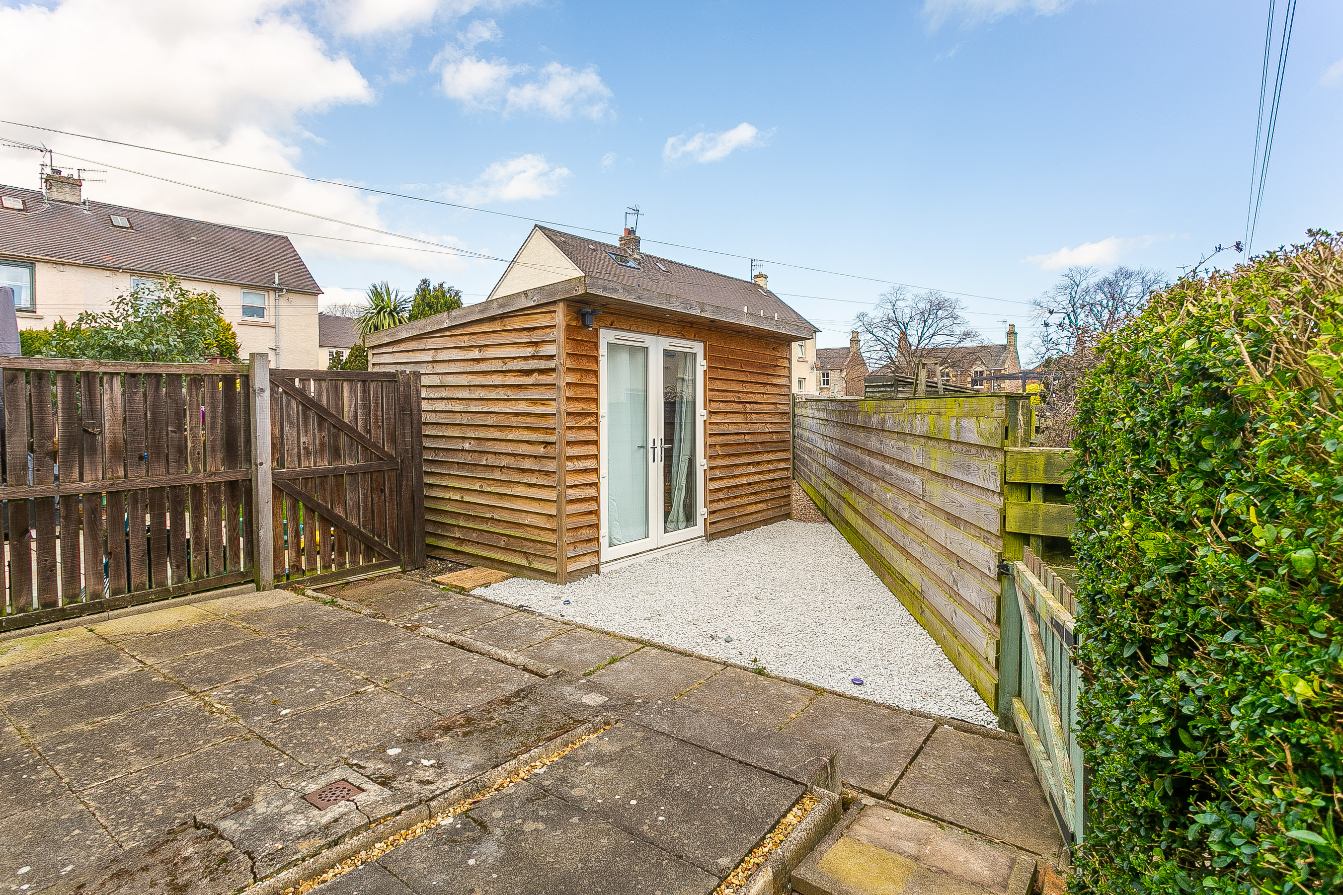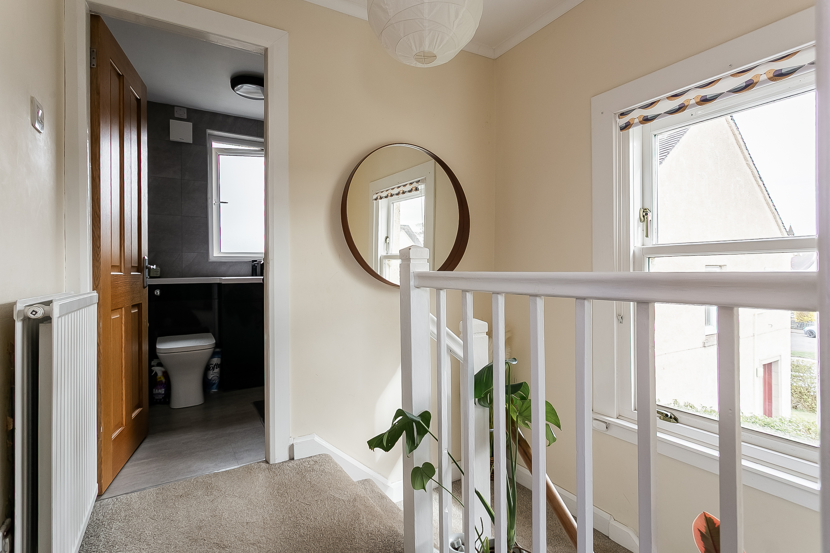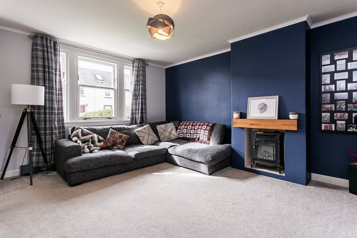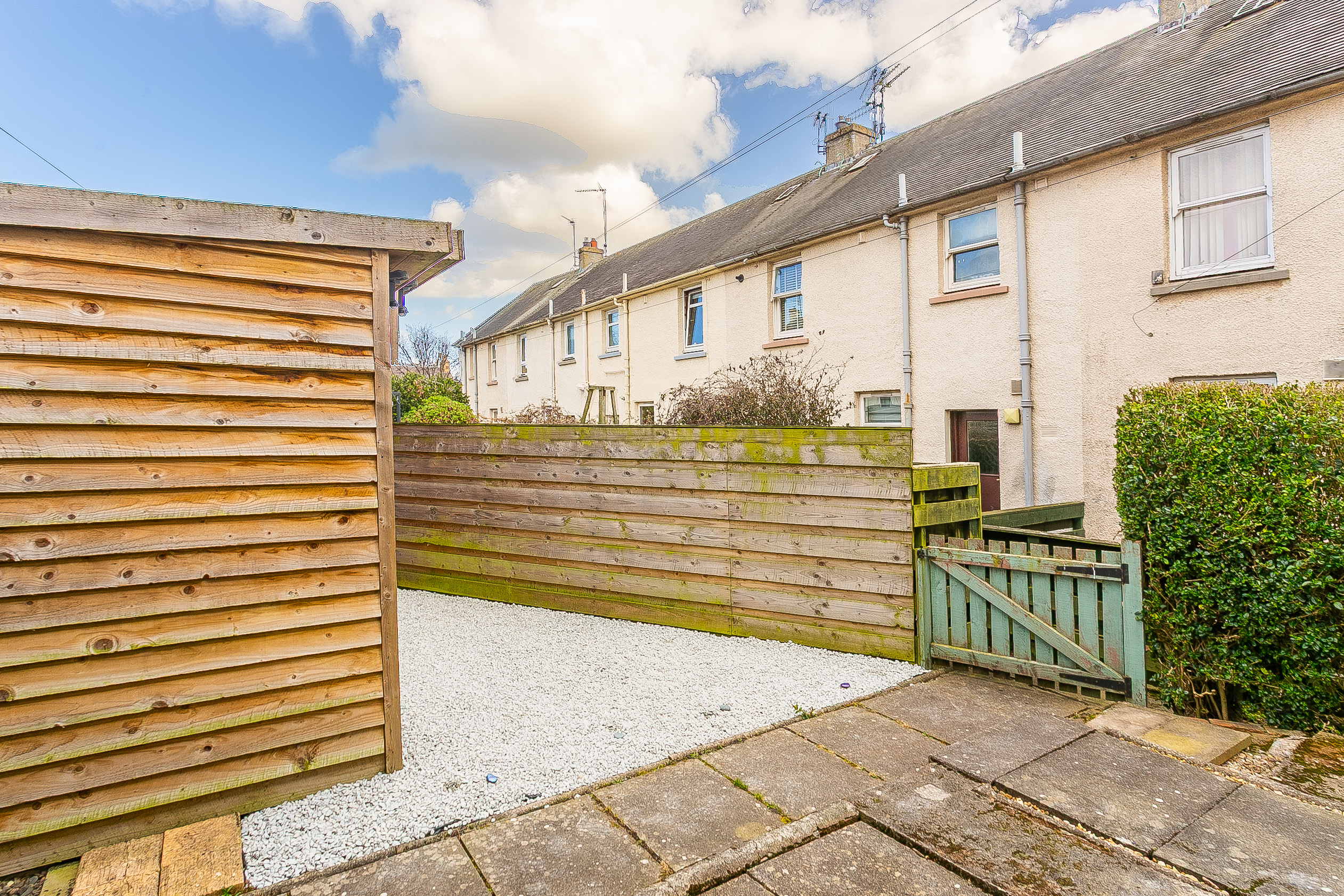 Light, beautifully presented and set on a desirable corner plot, this two-bedroom end-terrace villa offers private gardens and a driveway. Located within a well-established and rarely available residential area of the historic market town of Haddington, East Lothian. A welcoming entrance hall leads into a bright, front-facing living room, enjoying a south-west aspect that fills the space with natural light. Tastefully decorated and finished with carpeted flooring, the room also features a charming wood mantel with space for an electric stove, along with a useful storage cupboard.