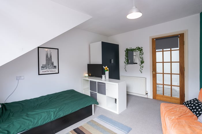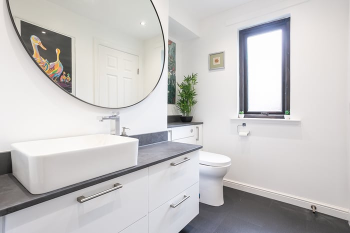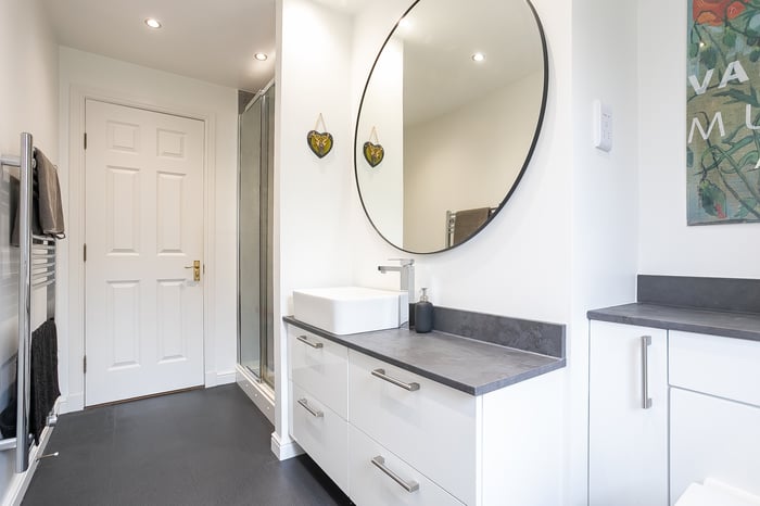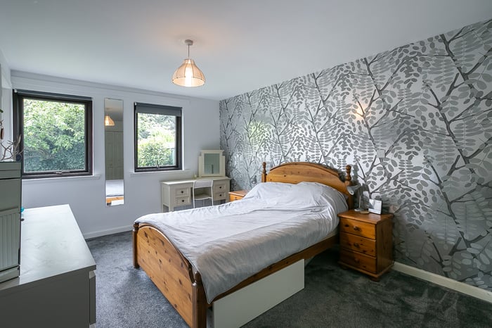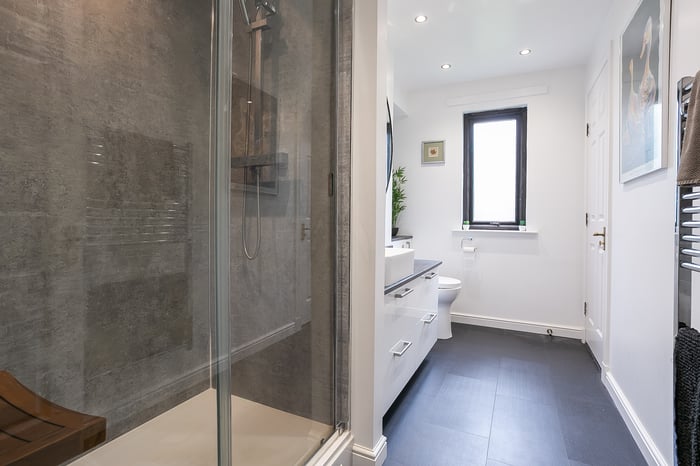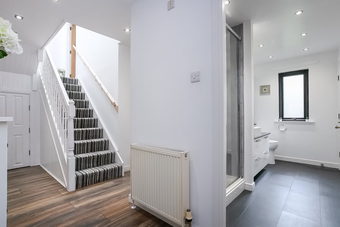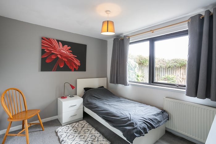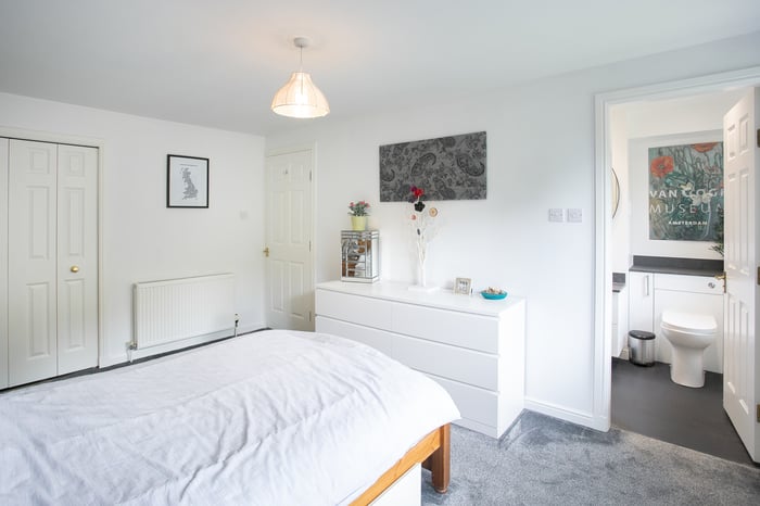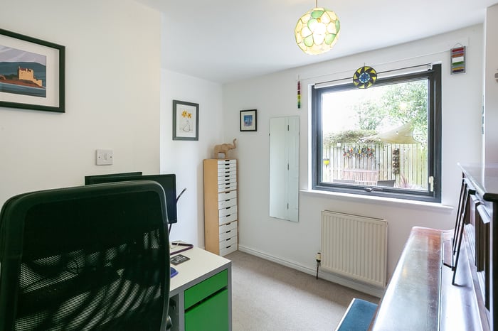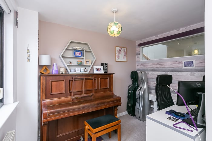 A front-facing master bedroom enjoys built-in wardrobe storage and a spacious, en-suite shower room, with separate hall access. Set to the rear, a second bedroom also benefits from integrated wardrobe storage, whilst a further bedroom, currently utilised as a home office, offers flexibility and options for use.