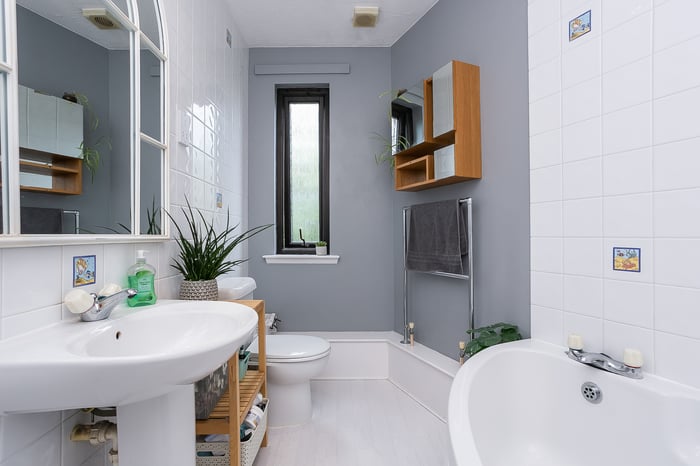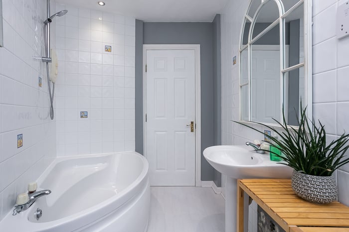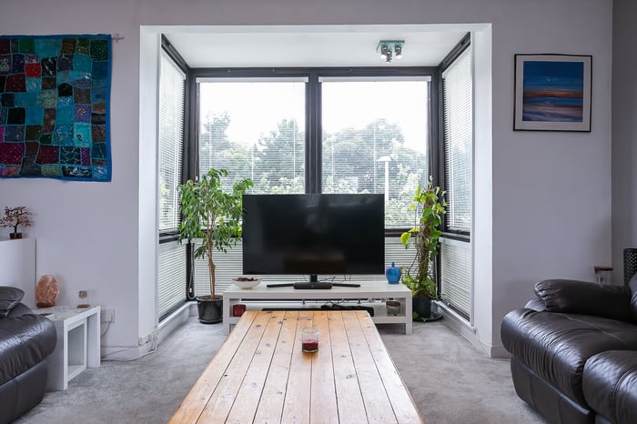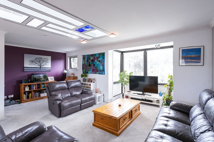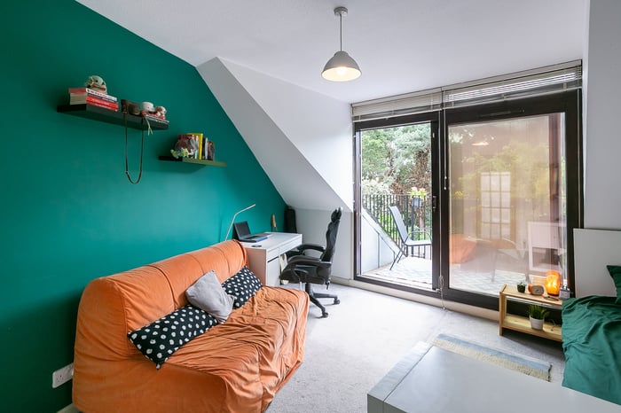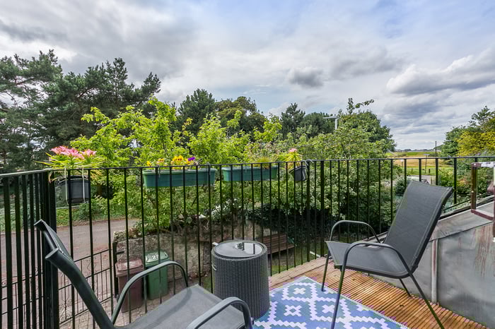 The remaining bedroom opens onto a balcony, with pleasant leafy views whilst, completing the accommodation, a bathroom comprises a three-piece suite, including a corner bath, a shower-over-bath and tiled splash walls.