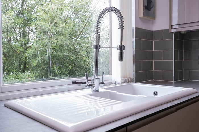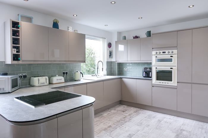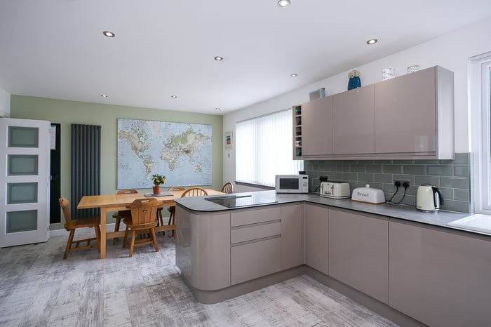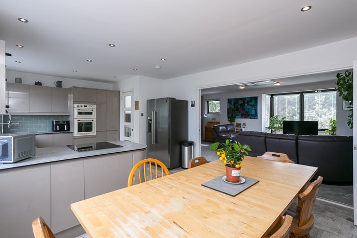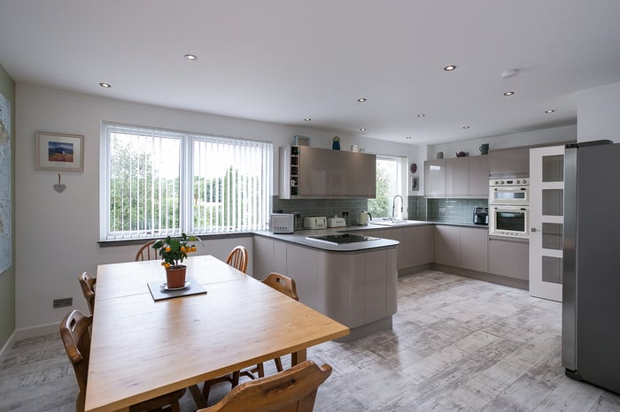 Enjoying open, countryside views, the kitchen provides space for a family-sized dining table and chairs and includes stylish, contemporary units and worktops and a breakfast bar. Appliances include an integrated induction hob, an eye-level double oven and an American-style fridge/freezer.
